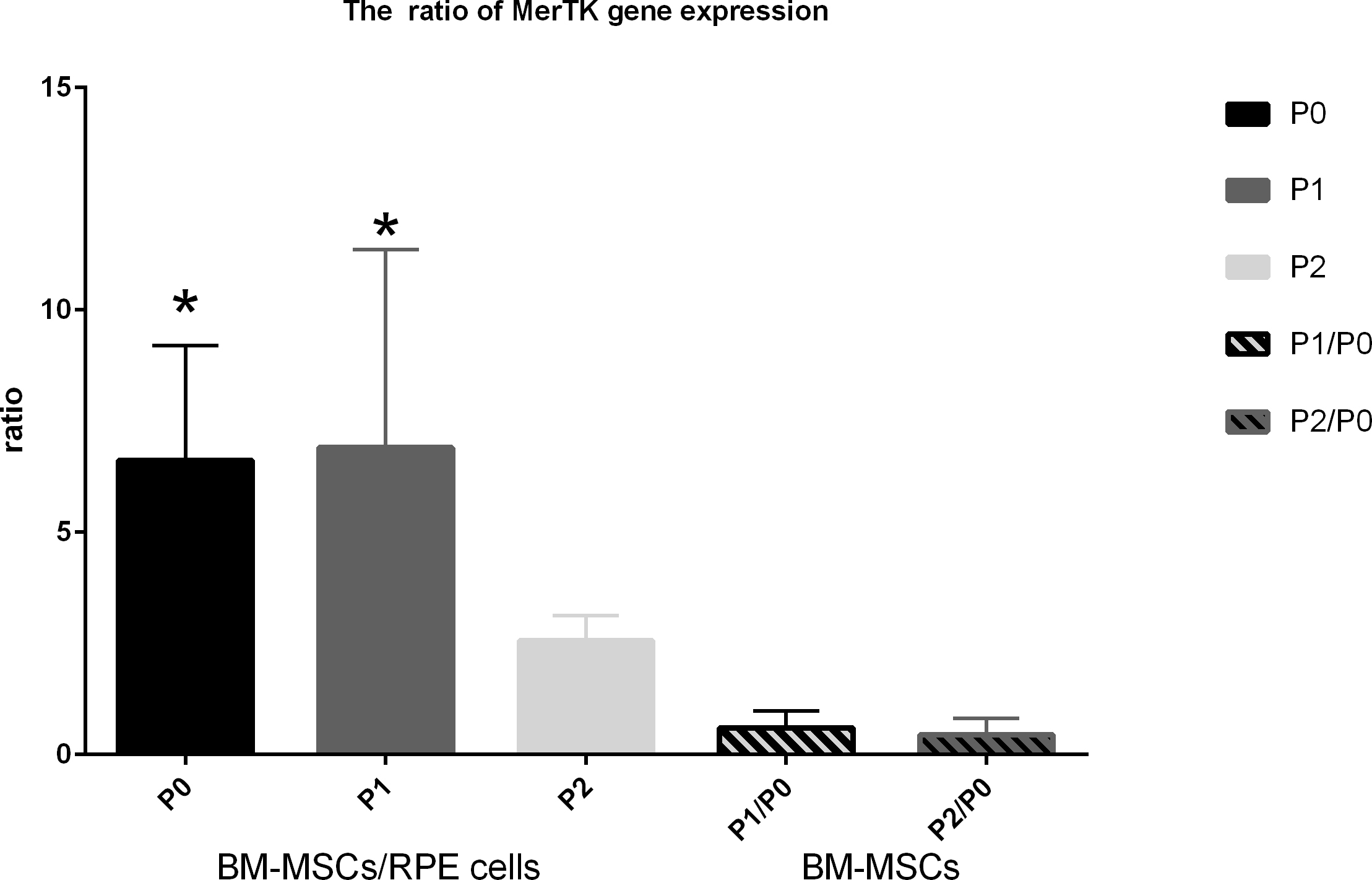 are standard deviation (SD). The data were analyzed with one-way ANOVA. The Mertk gene expression of BM-MSCs was significant greater than RPE cells at P0 and P1.