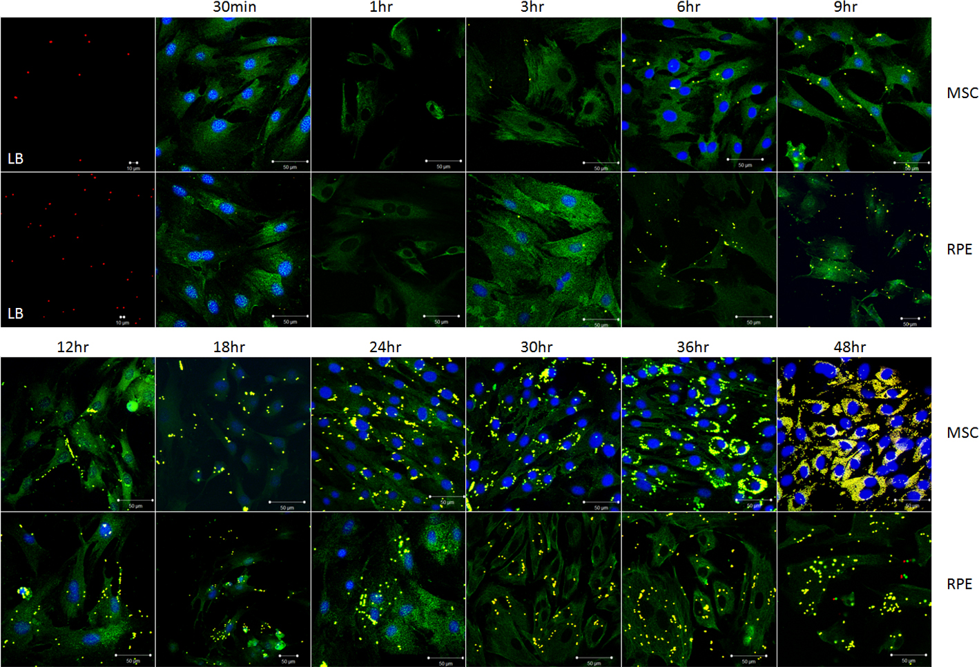 different time periods. Rows 2 and 4 show RPE cells incubated with LBs for different time periods. The latex beads phagocytized