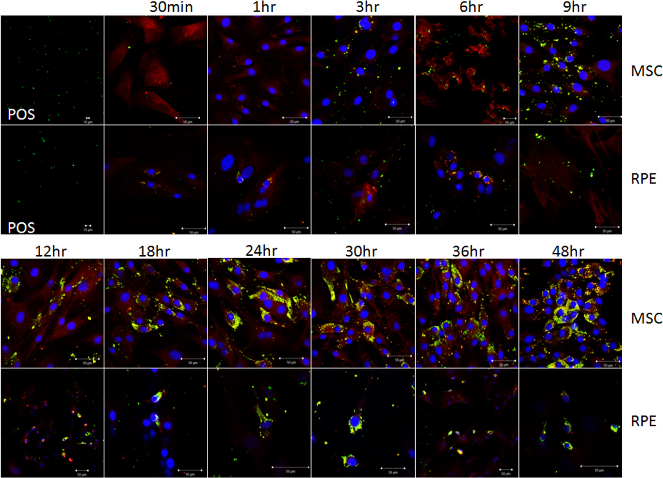 Figure 4. POS phagocytosis by BM-MSCs and RPE cells. The first picture in rows 1 and 2 exhibits the photoreceptor outer segment (POS)