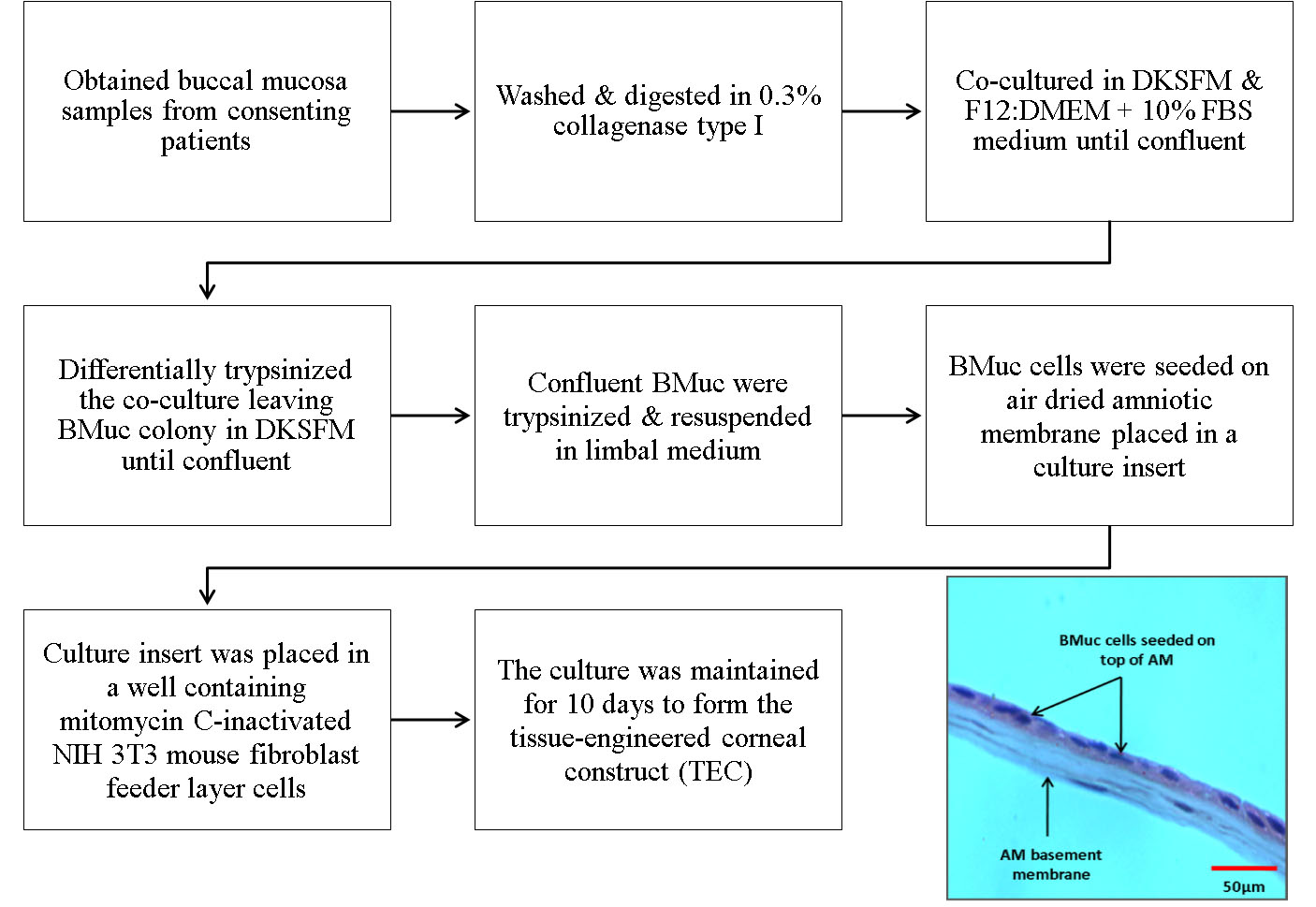 Figure 1. Schematic diagram of BMuc culturing process and the formation of tissue engineered corneal construct (TEC). Photo insert shows