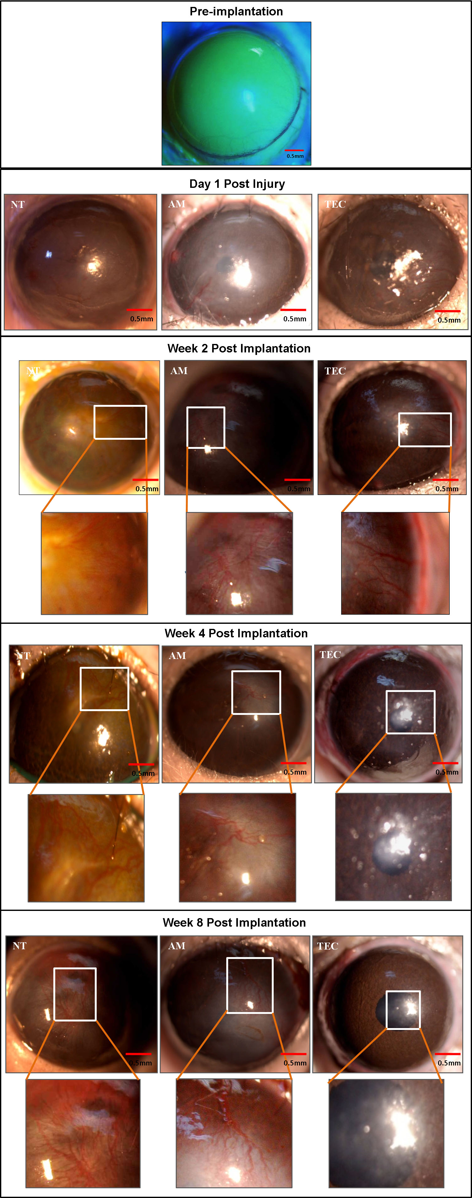 green color in the rest of the photos shows that full coverage of the corneal epithelium has been achieved by Week 2. Microscopic