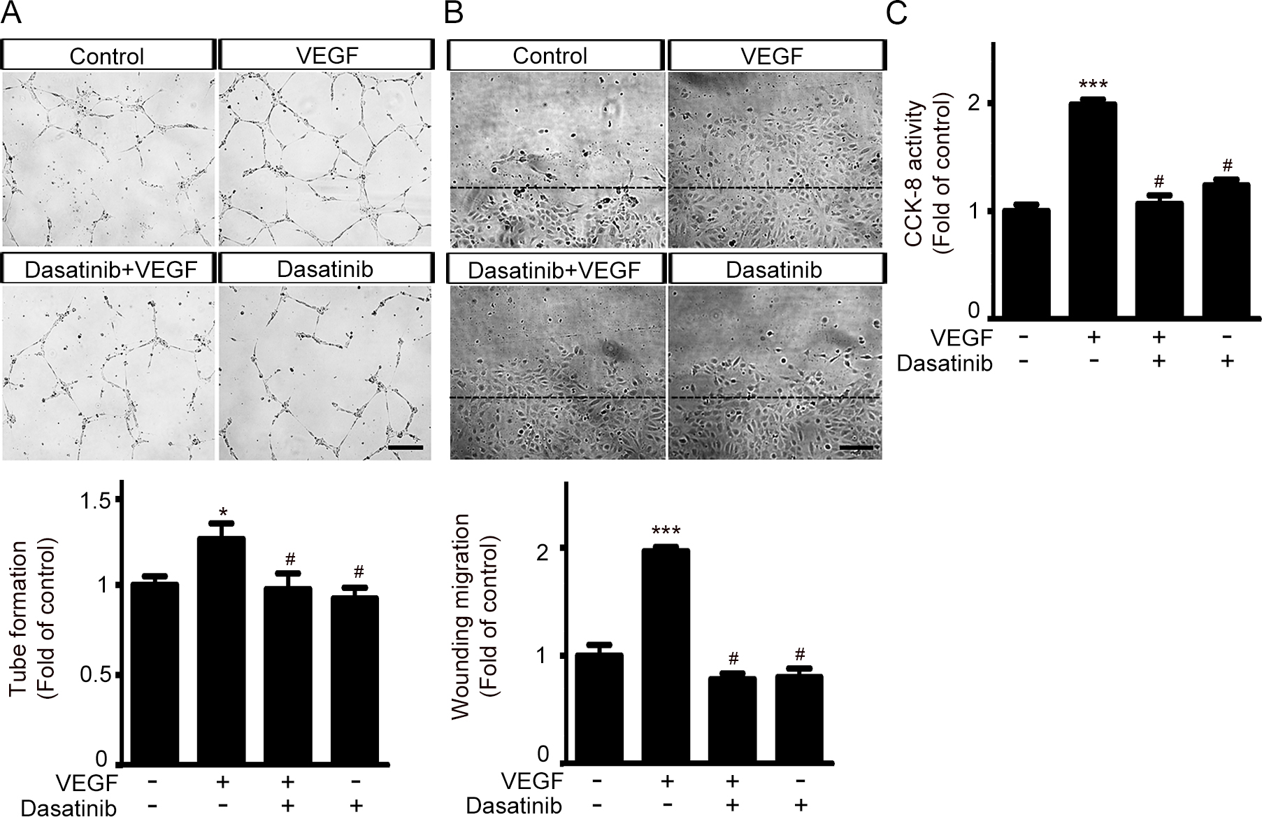 Figure 1. Dasatinib inhibits VEGF-induced increase in endothelial tube formation, scratch wounding migration, and cell proliferation.