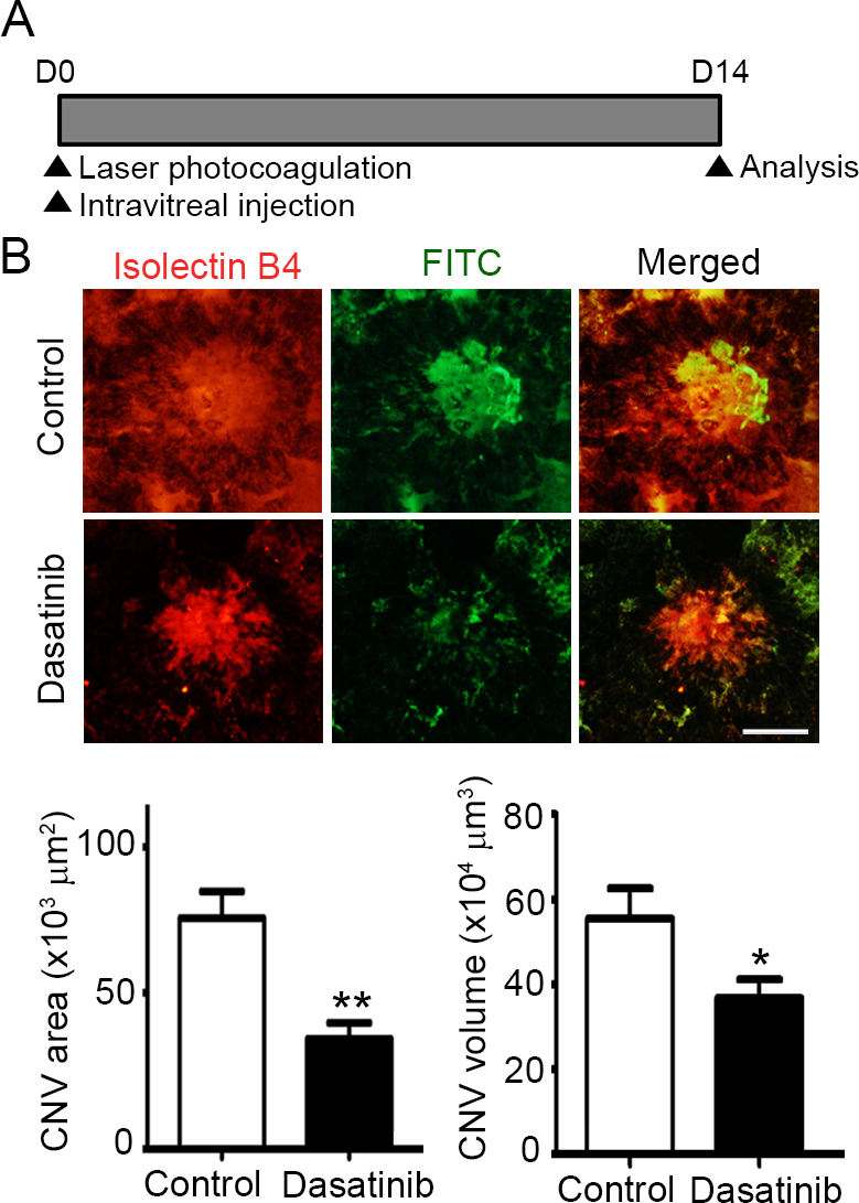 Figure 3. Dasatinib suppresses the development of CNV in a laser-induced mouse model. A: Schematic diagram of the laser-induced choroidal neovascularization (CNV) experiment. Immediately after laser photocoagulation,