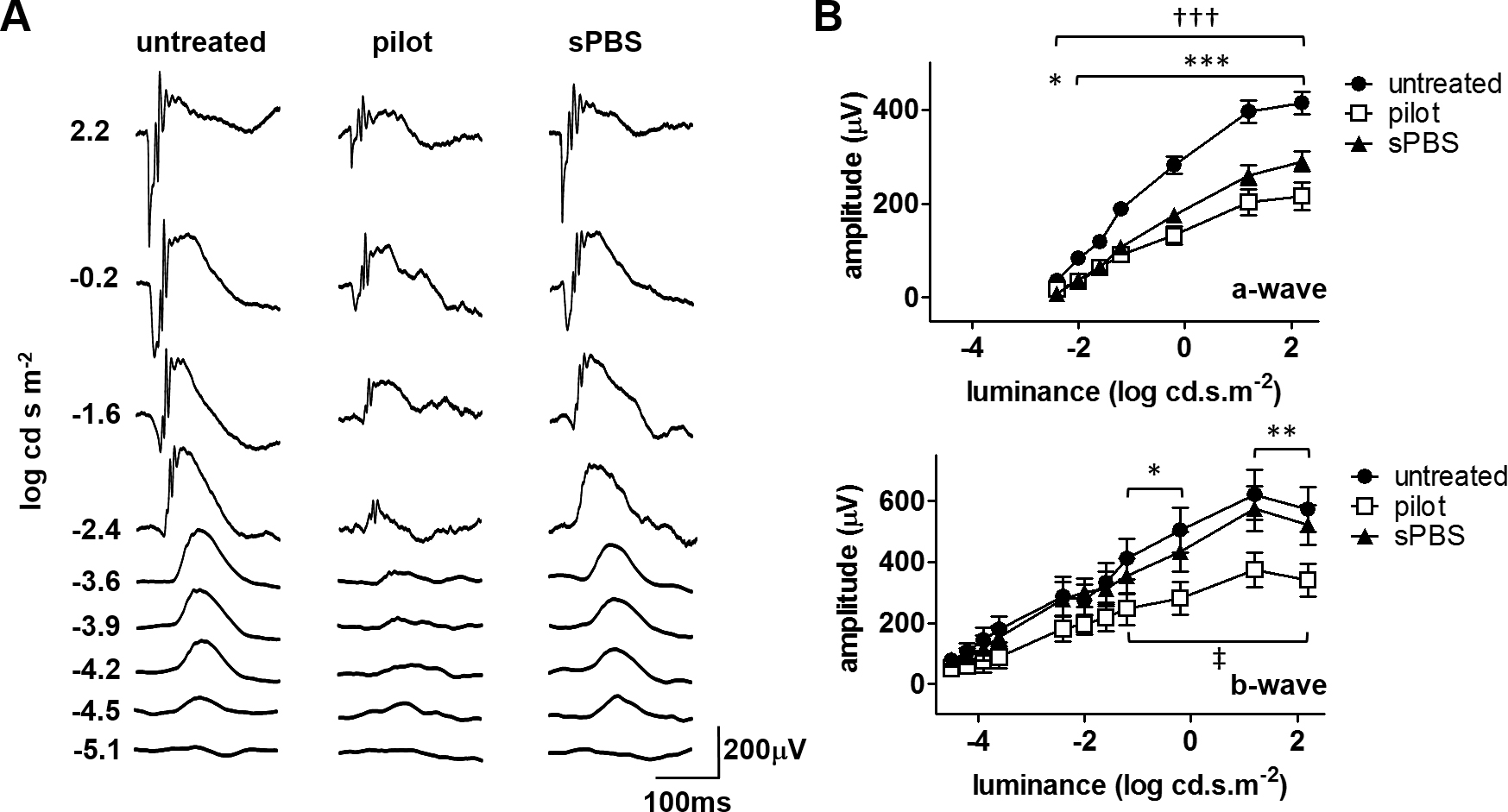 significantly smaller in the sPBS-treated eyes compared to the untreated eyes (†††p<0.001, n=10). The b-wave was increased