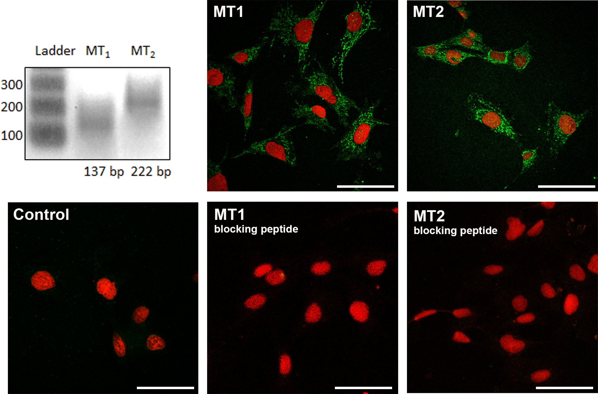 Figure 1. MEL receptor type 1 (MT1) and melatonin receptor type 2 (MT2) in 661W cells. The top left panel shows MT1 and MT2 RNA expression. Ladder=100 bp. MT1 and MT2 immunoreactivity (green) was detected in 661W cells. Secondary antibody control without a primary antibody (the bottom left