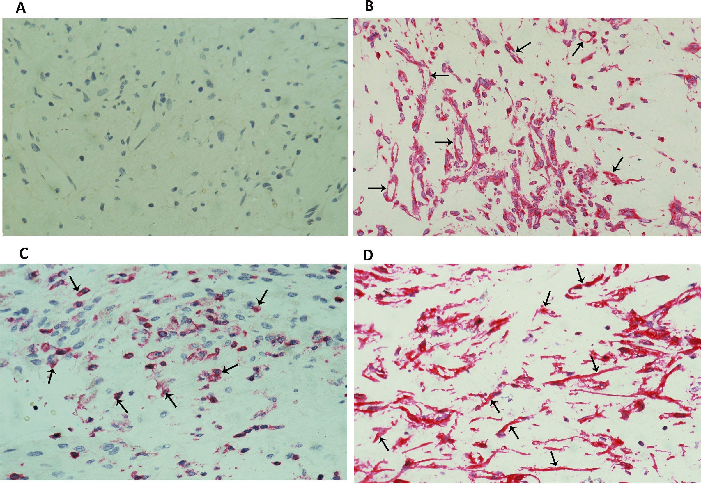 Figure 3. PDR epiretinal membrane immunostaining. Negative control slide showing no labeling A: immunohistochemical staining of CD31 showing blood vessels positive for this endothelial cell marker (arrows; B; original magnification 25X); immunohistochemical staining of CD45 showing stromal cells positive for CD45 (arrows; C); immunohistochemical staining of α-smooth muscle actin showing immunoreactivity in myofibroblasts (arrows; D; original magnification 40X).