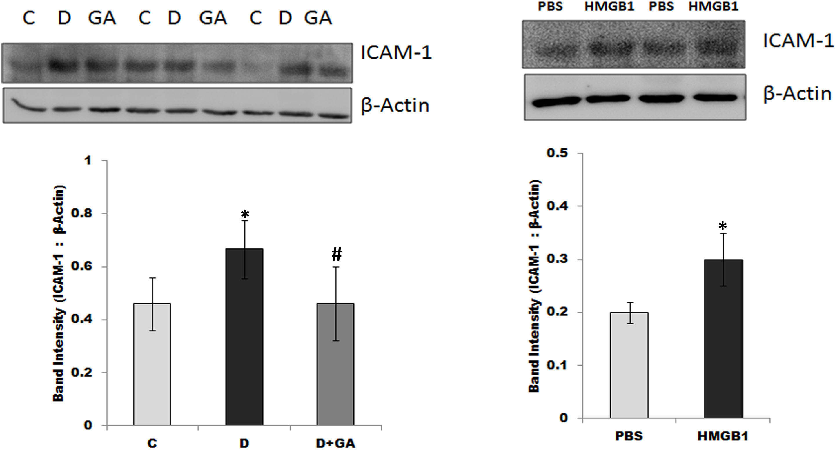 (D) compared to the non-diabetic controls (C; *p<0.05; Mann–Whitney U test). The diabetes-induced upregulation of ICAM-1 is attenuated in glycyrrhizic acid (GA)-fed diabetic rats (p<0.05; Mann–Whitney