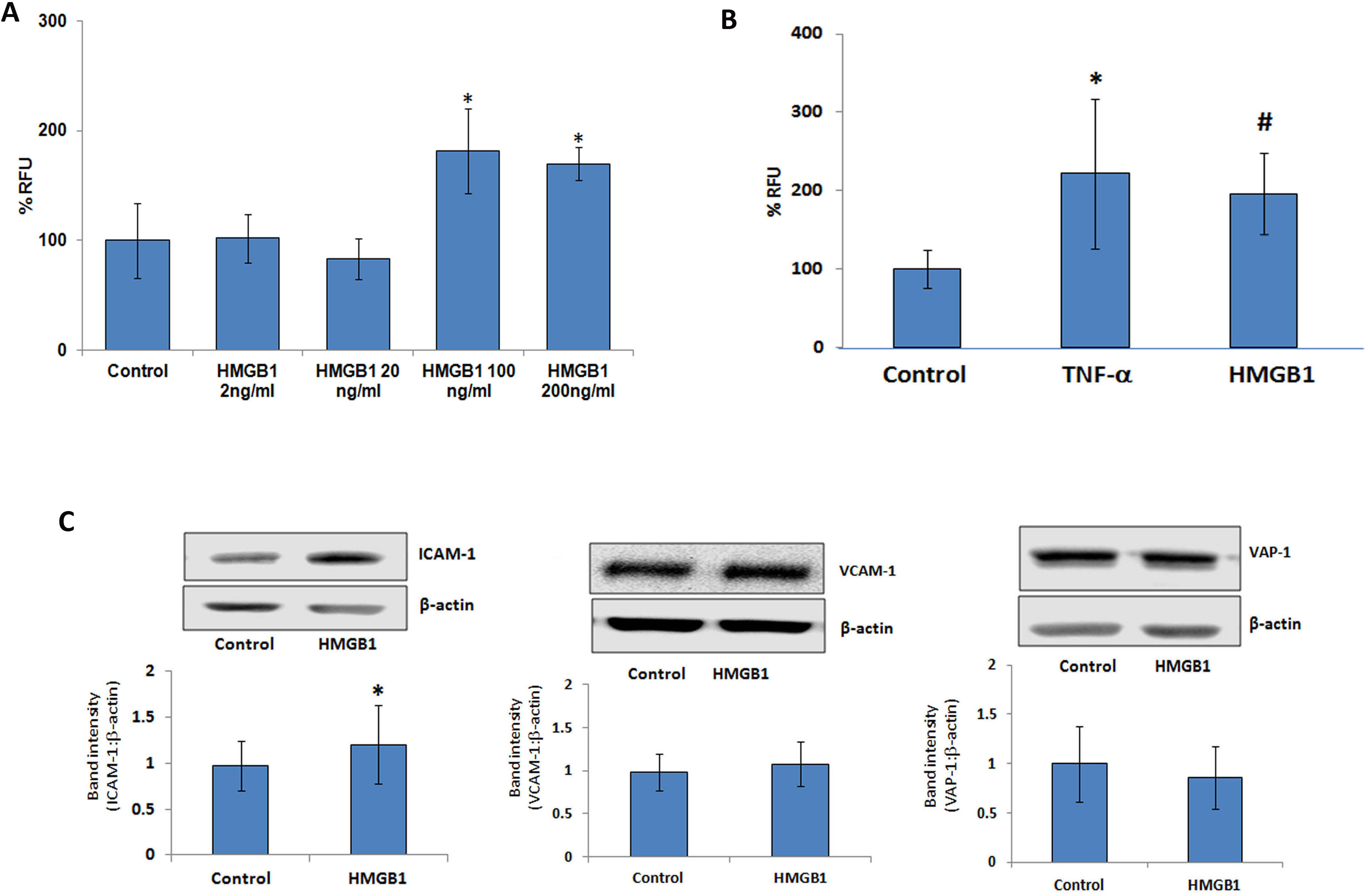 cells were lysed and quantified as described in the method section. Each group has at least three wells. B: TNF-α (1 ng/ml; *p<0.05; Mann–Whitney U test) and HMGB1 (100 ng/ml; #p<0.05; Mann–Whitney U test) induced human leukocyte adhesion to HRMEC monolayers. The bar graph represents three independent experiments (control