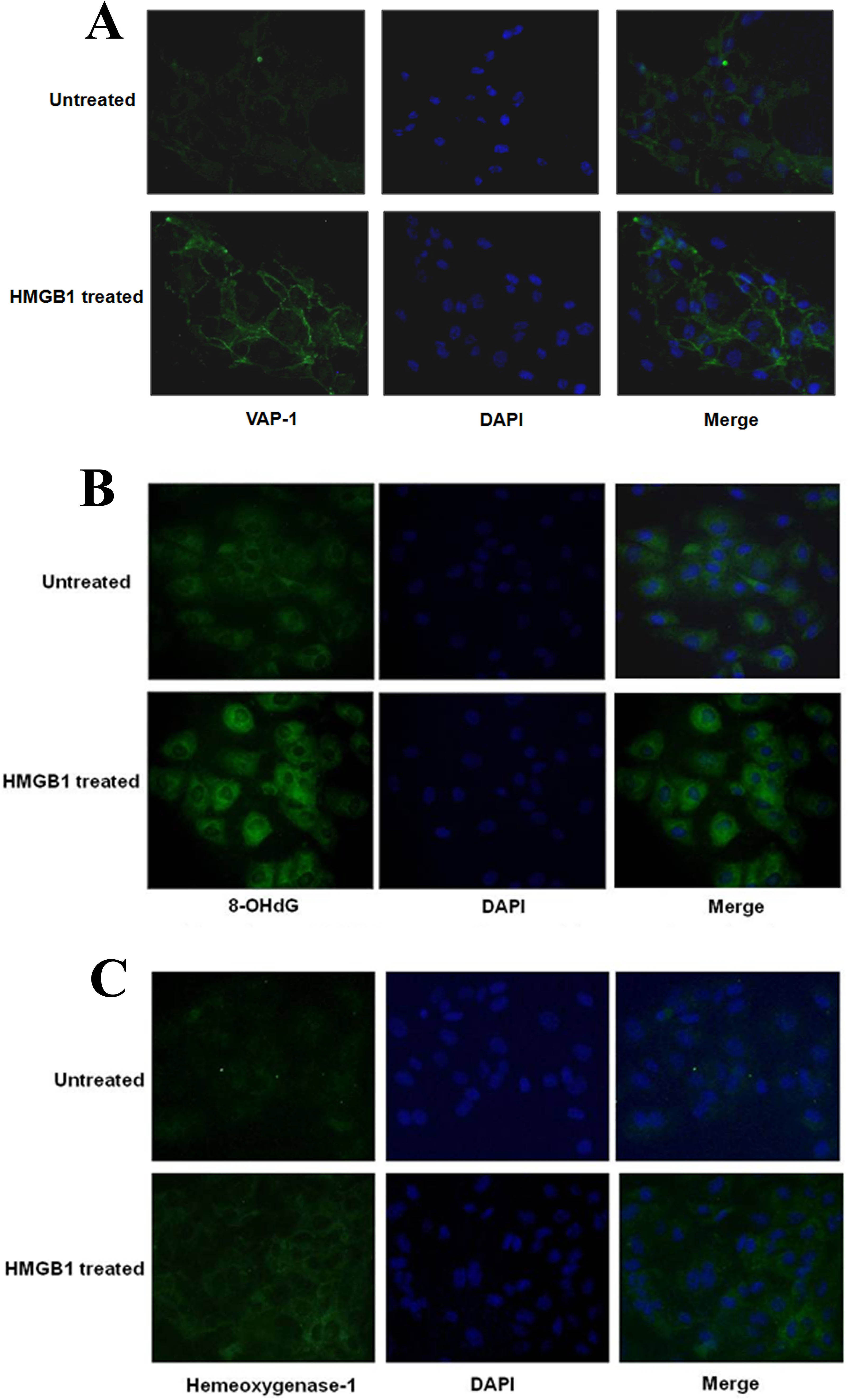 microscopy showed that HMGB1 treatment induced membranous VAP-1 translocation (A), the upregulation of cytoplasmic and nuclear immunoreactivities for 8-OHdG (B), and cytoplasmic immunoreactivity for HO-1 (C; green). Nuclei were counterstained with DAPI (blue).
