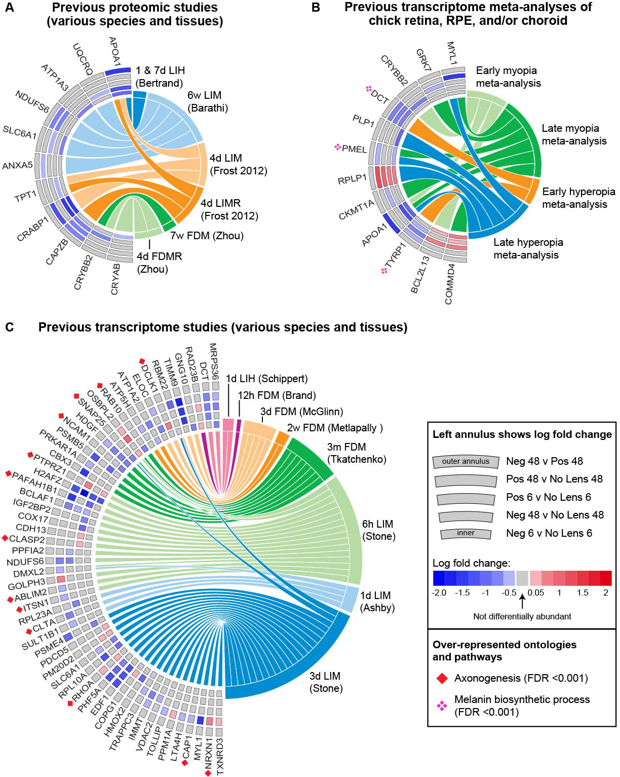 in previous meta-analyses of chick refractive error transcriptome studies. C: Chord diagram showing the 55 proteins that were differentially abundant in the present study and differentially expressed