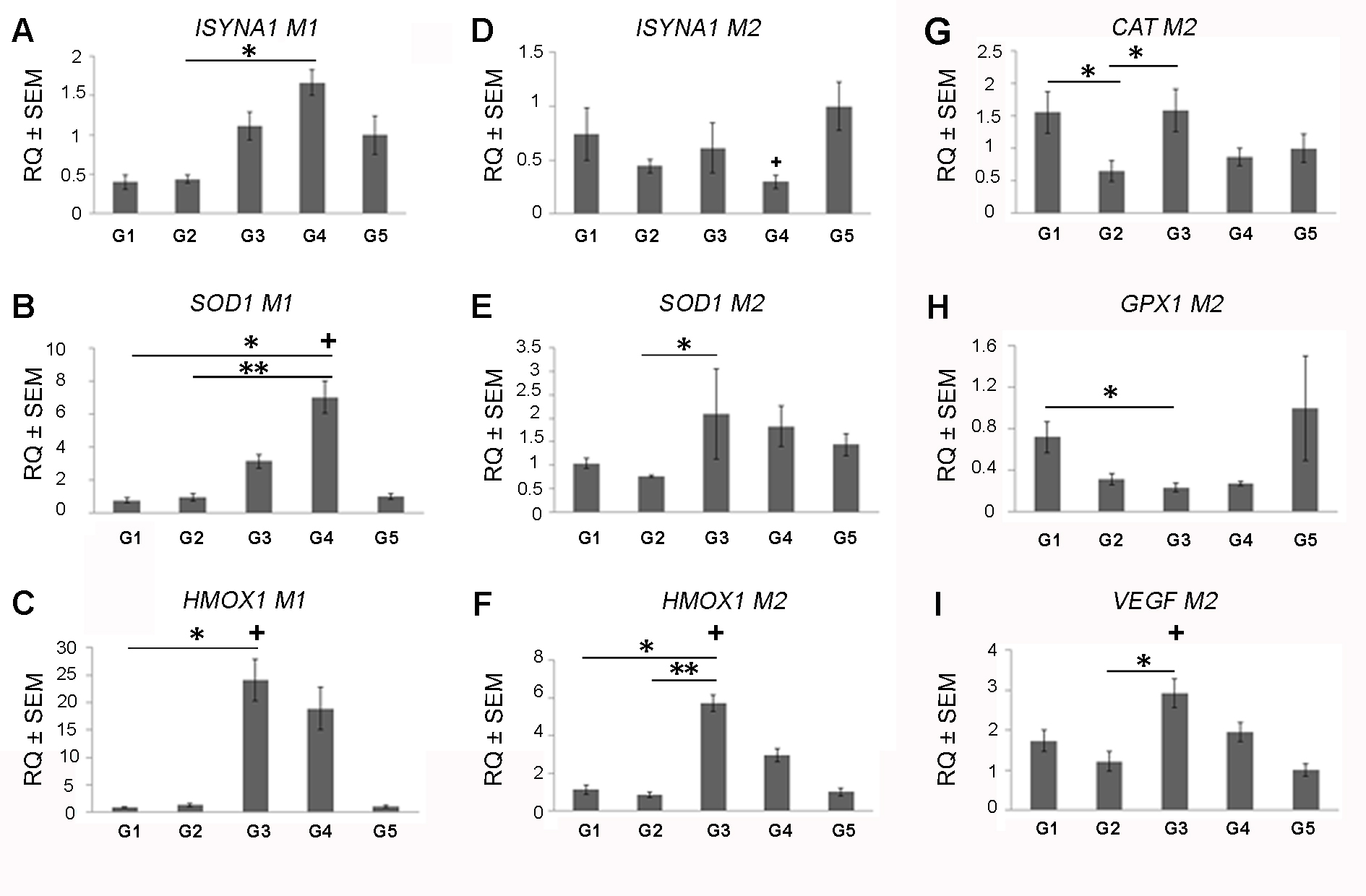 synthase 1 (ISYNA1), superoxide dismutase 1 (SOD1), and heme oxygenase 1 (HMOX1) of M1 and M2 are shown in panels A–C and D–F, respectively. Expression of catalase (CAT), glutathione peroxidase 1(GPX1), and vascular endothelial growth factor α (VEGFa) of M2 macrophages are shown in panels G–I, respectively. Gene expression of macrophages treated with supplements was compared to DMSO-treated macrophages from each