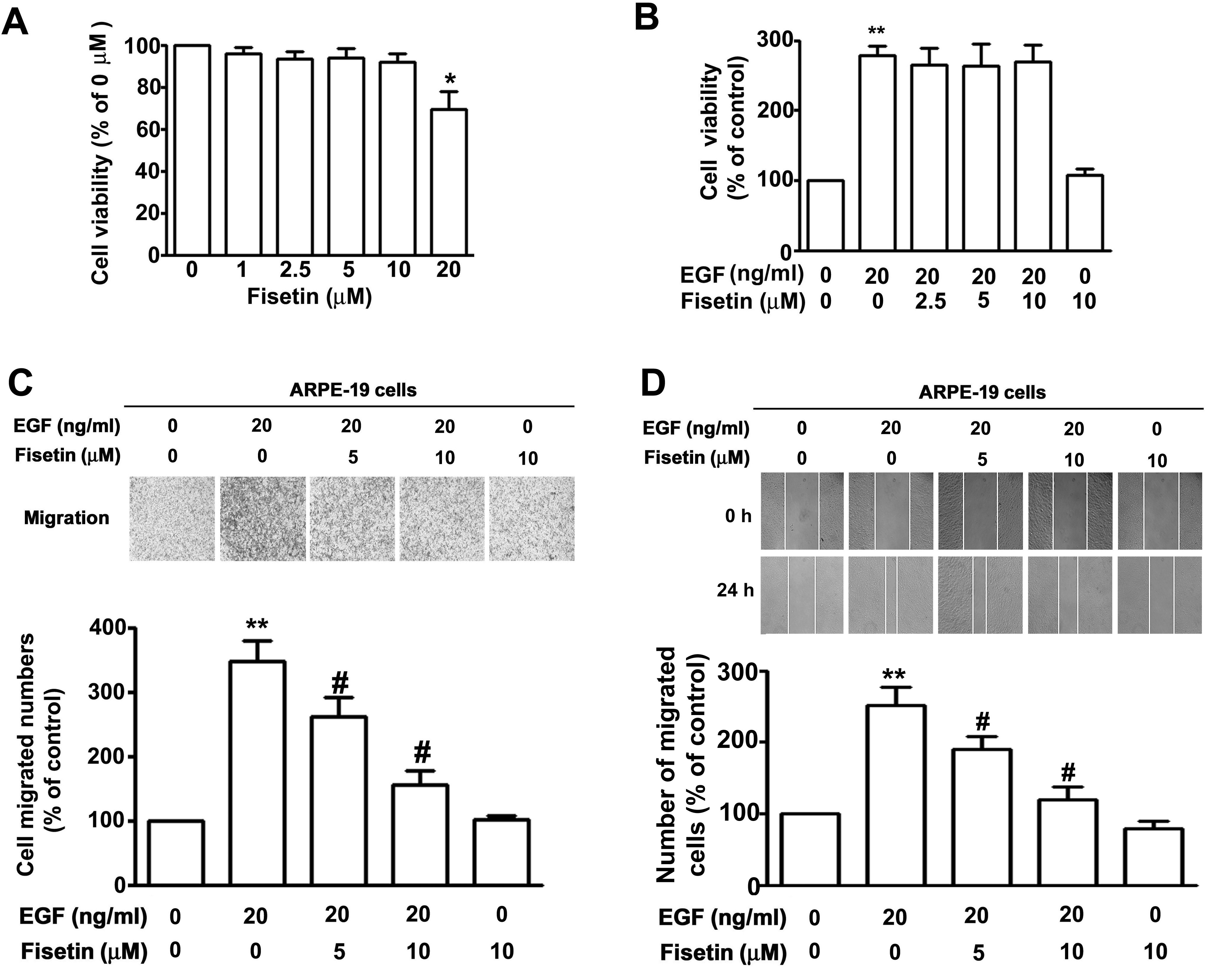 concentrations of fisetin (5, 10, and 20 μM) for 24 h before analysis with the MTT assay. C: In vitro determination of cell migration. D: Microscopy images of ARPE-19 cell migration after scratch (time 0) and after 12 h of EGF, EGF (100 ng/ml) or EGF (100 ng/ml)