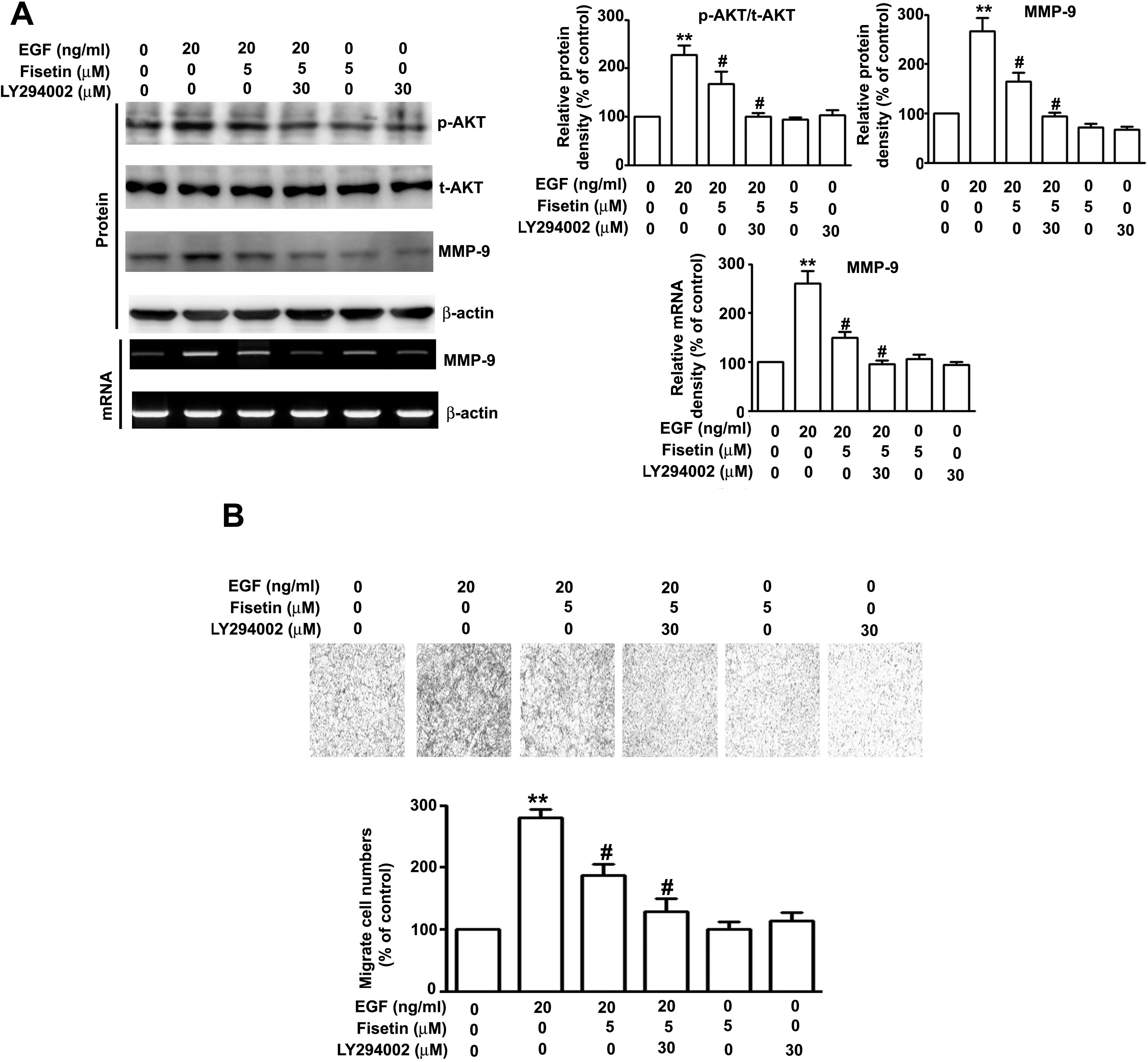 Figure 3. Effects of treatment with either fisetin or LY294002 on EGF-induced AKT activation in ARPE-19 cells. A: ARPE-19 cells were treated with epidermal growth factor (EGF; 20 ng/ml) or were cotreated with EGF (20 ng/ml) plus fisetin