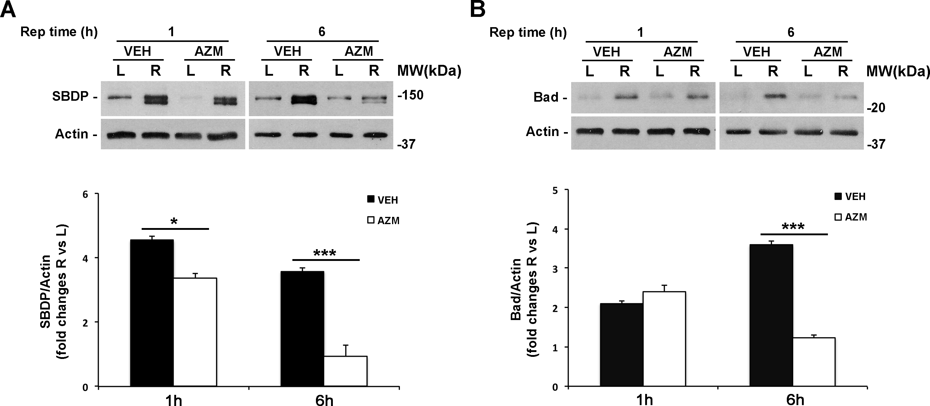 Figure 2. Azithromycin prevents calpain activation and Bad upregulation following retinal ischemia/reperfusion. A: Immunoblotting showing the reduced accumulation of calpain-specific 150/145 kDa SBDP and (B) Bcl-2-associated death promoter (Bad) expression levels after 1 and 6 h of reperfusion in the ischemic retina of azithromycin-treated