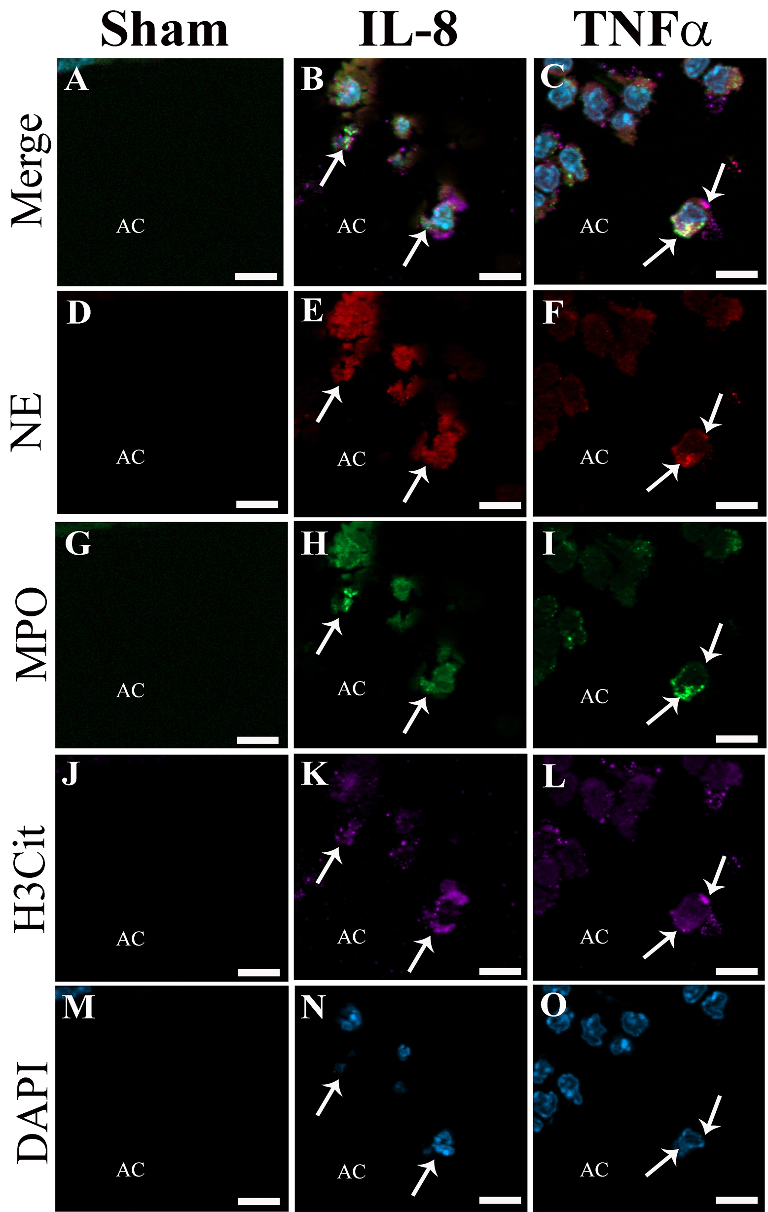 (TNF-α) and were based on colocalization of neutrophil elastase (NE, red; E, F, arrows), myeloperoxidase (MPO, green; H, I, arrows), and H3Cit (purple; K, L, arrows). 4',6-diamidino-2-phenylindole (DAPI, blue; N, O, arrows) shows the nuclear morphology. Magnification = 63X. Scale bar = 50 μm.