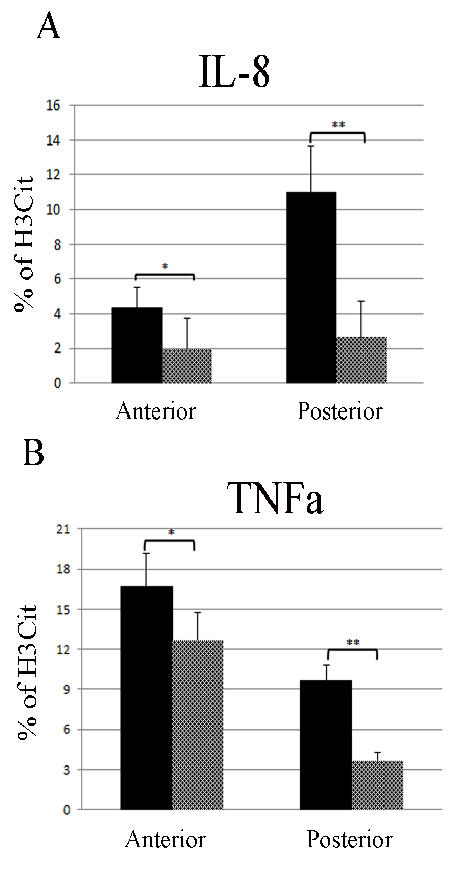 without DNase I treatment in the anterior and posterior chambers of interleukin (IL)-8 (A) and tumor necrosis factor alpha (TNF-α) (B). *Statistically significant; p<0.05, ** highly significant, p<0.001.