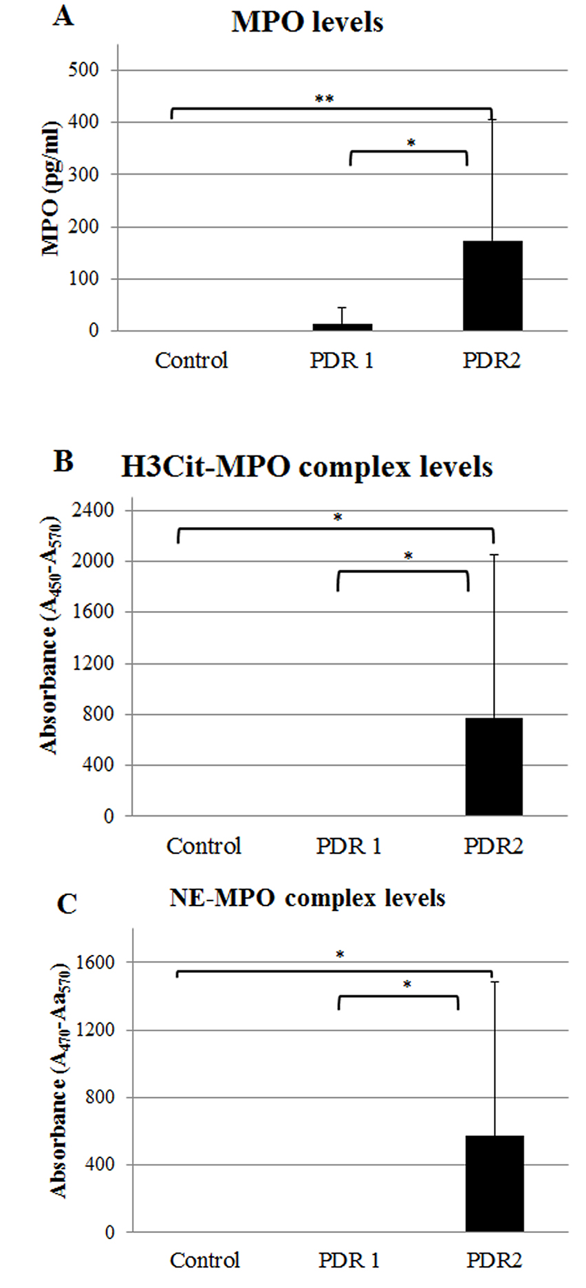 Figure 6. Vitreous levels of NET complexes found in patients with PDR. Myeloperoxidase (MPO) (A), citrullinated histone 3-myeloperoxidase (H3Cit-MPO) complex (B), and neutrophil elastase-myeloperoxidase (NE-MPO) complex (C). PDR = proliferative diabetic retinopathy; PDR1 = had no need for repeated surgical intervention; PDR2 = had repeated vitreous