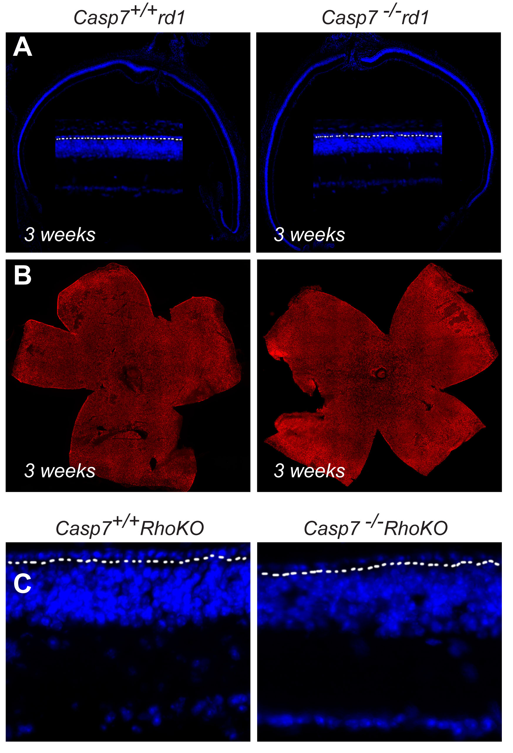 of cone death (genotype and age same as in panel A). C: Retinal cross section of 17-week-old Casp7+/+_Rho-KO and Casp7–/–_Rho-KO mice showing no difference in the thickness of the outer nuclear layer in the central retina (n = 3 animals; the dotted line