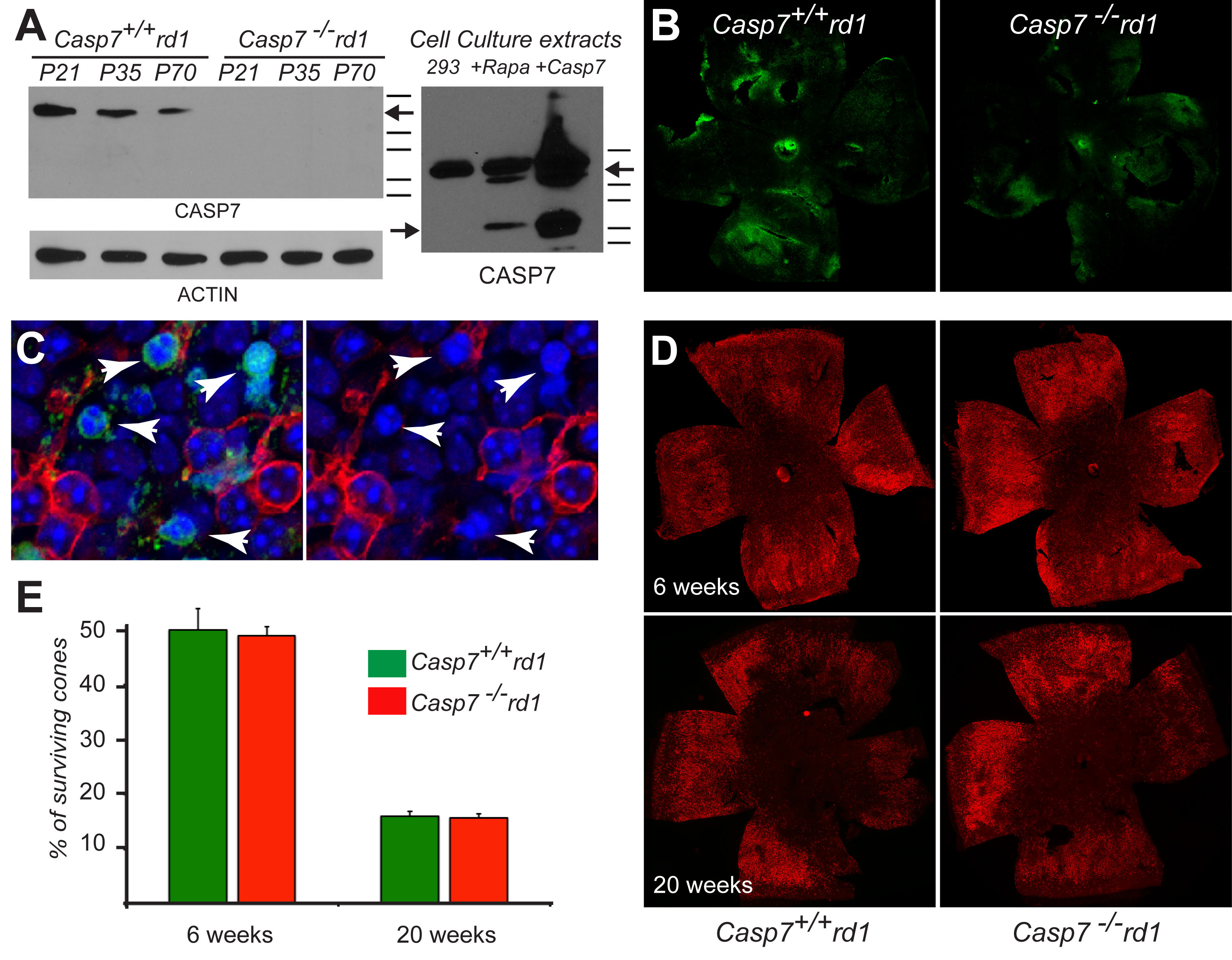 [DAPI]). D: Examples of retinal flat mounts of Casp7+/+_rd1 and Casp7–/–_rd1 mice stained for cone arrestin (red signal) expression at 6 and 20 weeks of age. E: Quantification of cone survival at 6 and 20 weeks of age showed no statistically significant improvement in cone survival