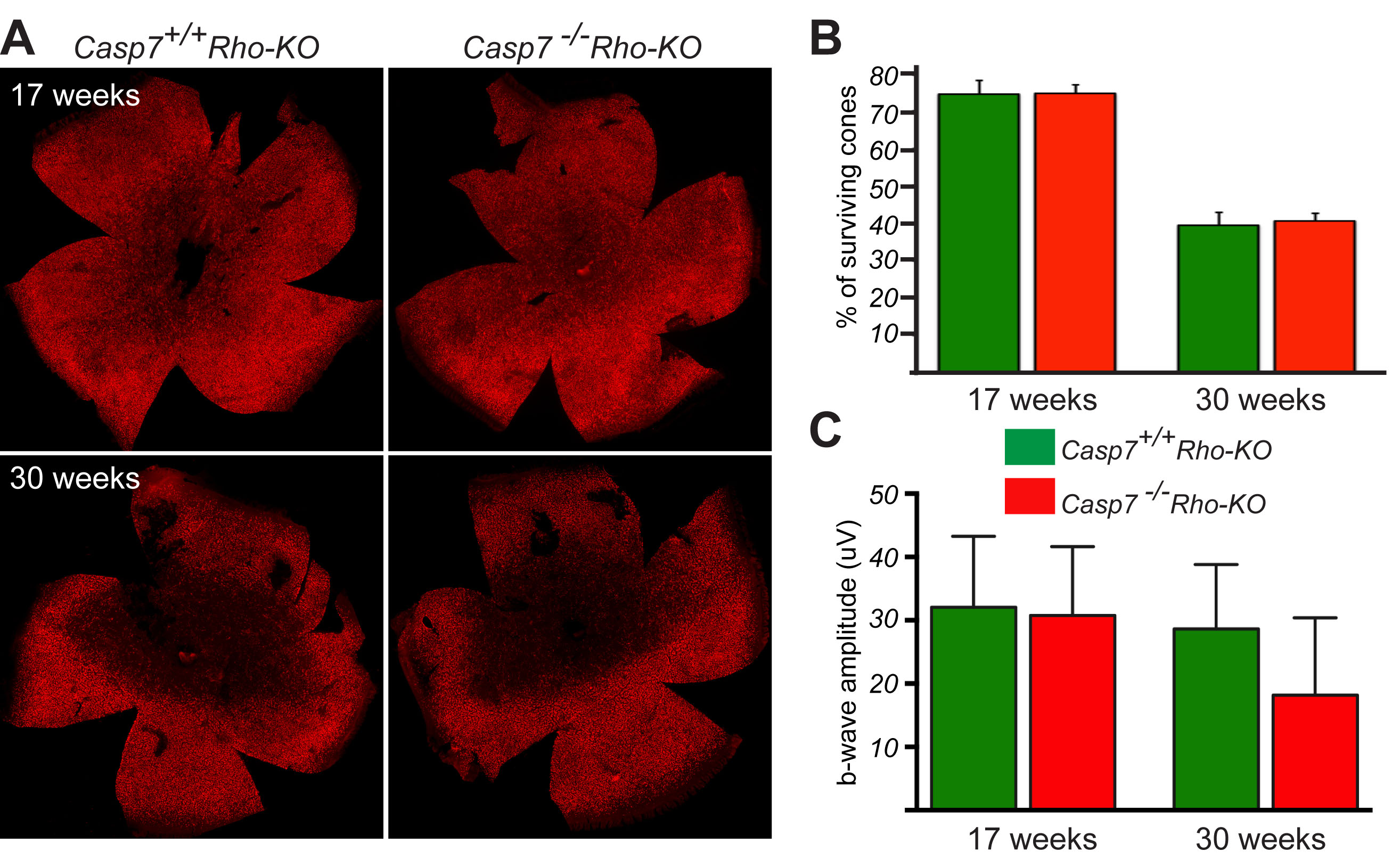 that corresponds to roughly 10 weeks in rd1 mice. B: Quantification of cone survival at 17 and 30 weeks of age of Casp7+/+_Rho-KO and Casp7–/–_Rho-KO mice. No statistically significant improvement in cone survival is seen upon loss of Casp7. C: B-wave amplitudes of photopic electroretinogram recordings showed also no statistically significant improvement in cone