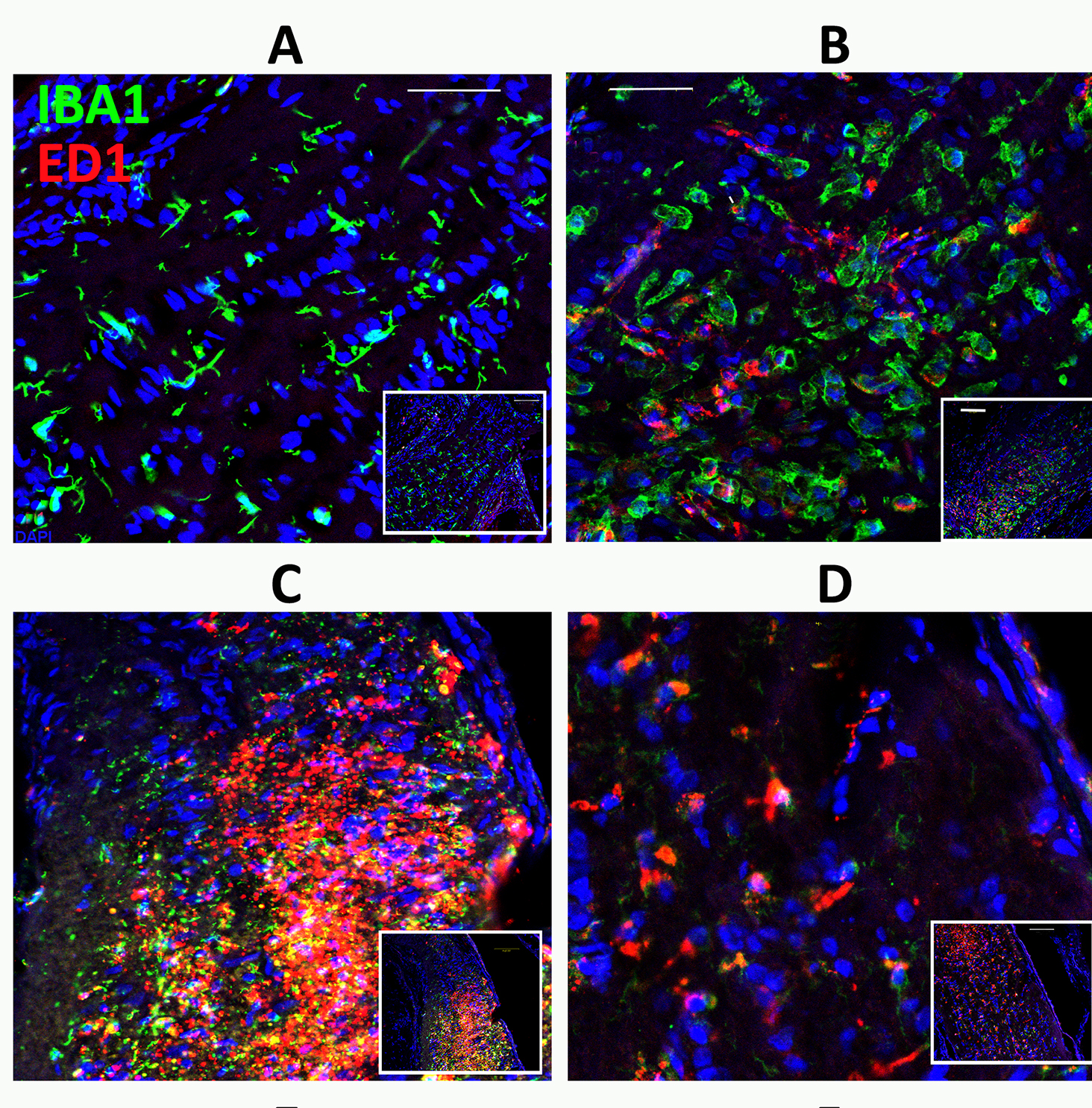 are now globoid (activated macrophages), and ED1-positive colocalization is present, indicating newly synthesized macrophages.