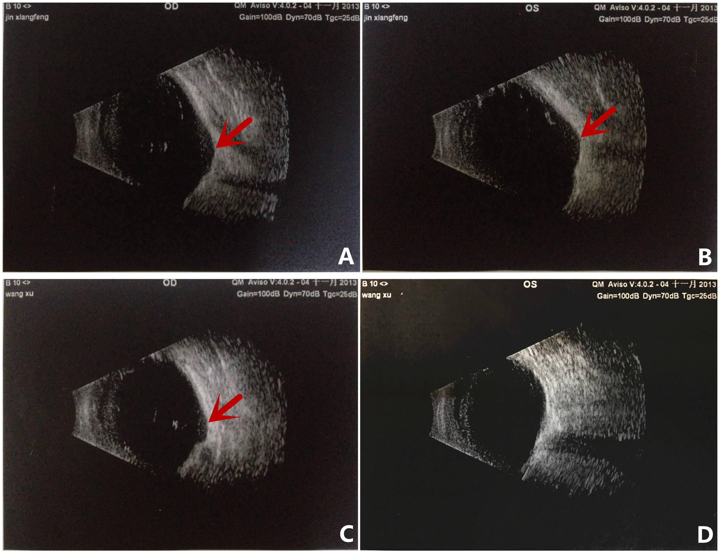Figure 3. B-ultrasonography images of patients from family B. A and B: Images of the right and left eyes, respectively of patient II:2. C and D: Images of the right and left eyes, respectively, of patient III:1. The B-ultrasonography images show posterior segment coloboma
