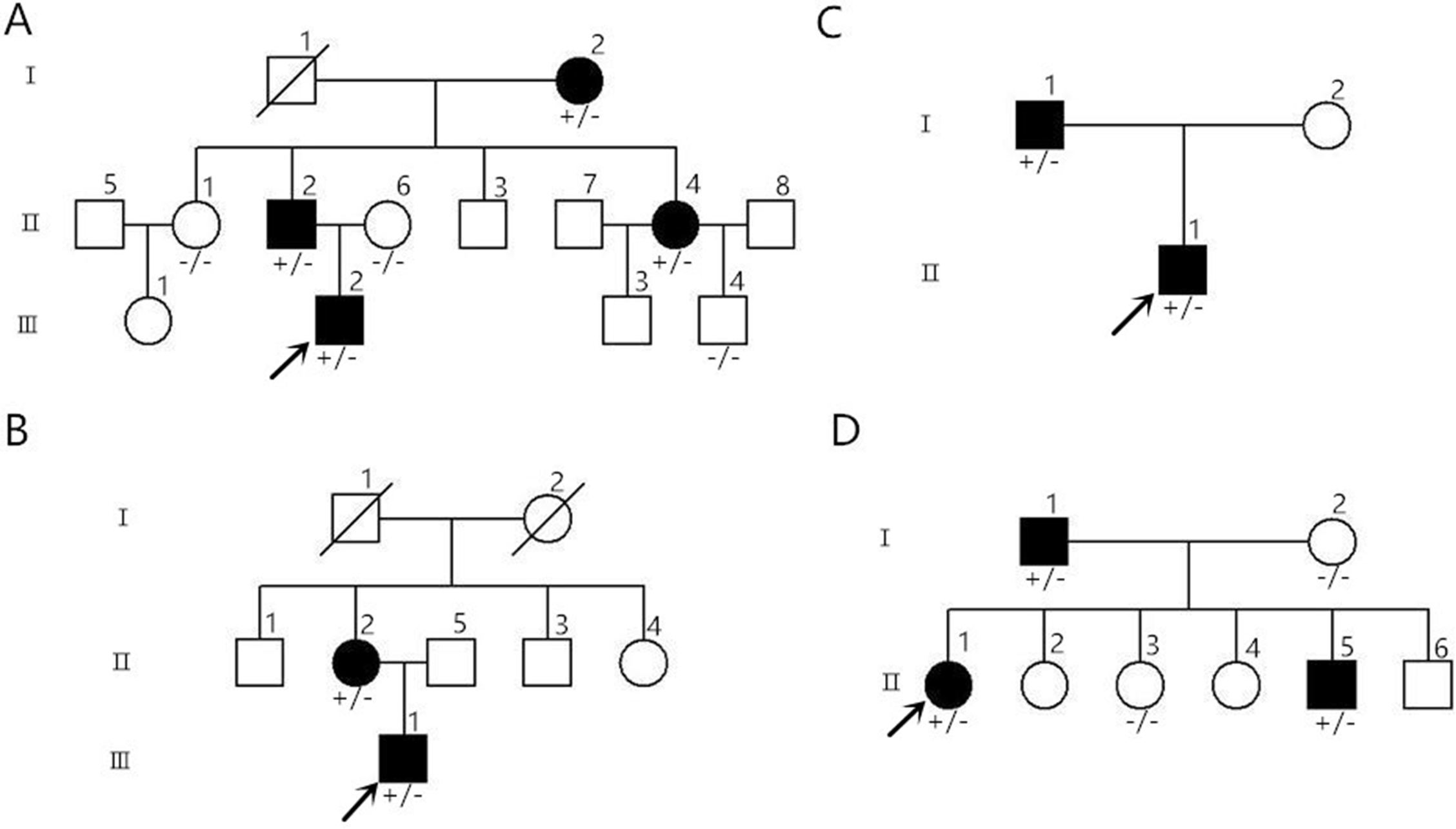 Figure 1. Pedigrees of four Chinese families. A–D: Pedigrees of family A through family D, respectively. Squares and circles indicate men and women, respectively. Filled and