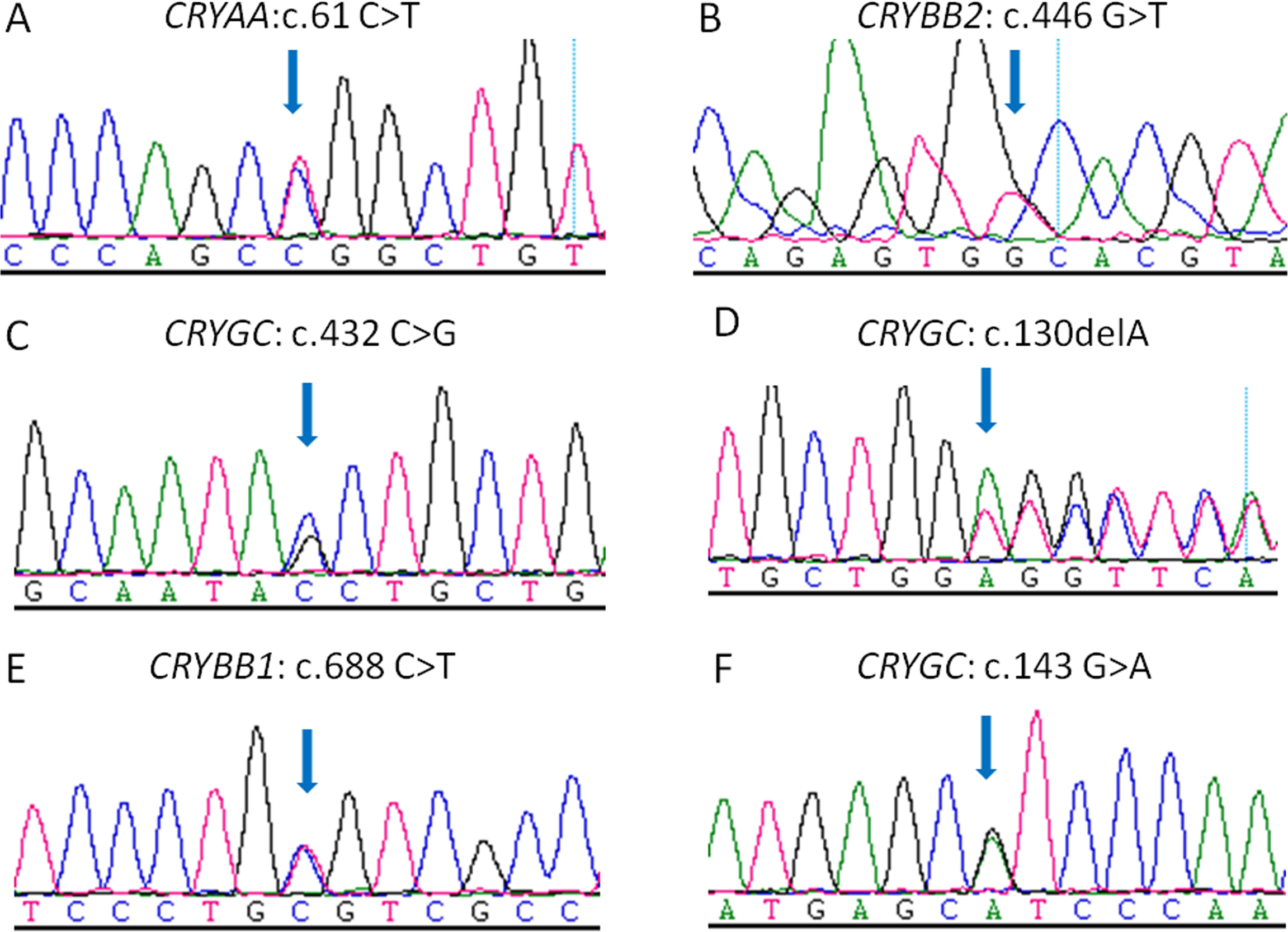 Figure 5. Chromatograms of all detected mutations. A: Sequence for patient III:2 from family A. B: Sequence for patient III:1 from family B. C: Sequence for patient II:1 from family C. D: Sequence for patient II:1 from family D. E: Sequence for simplex case 1. F: Sequence for simplex case 2. The arrow indicates the mutation.
