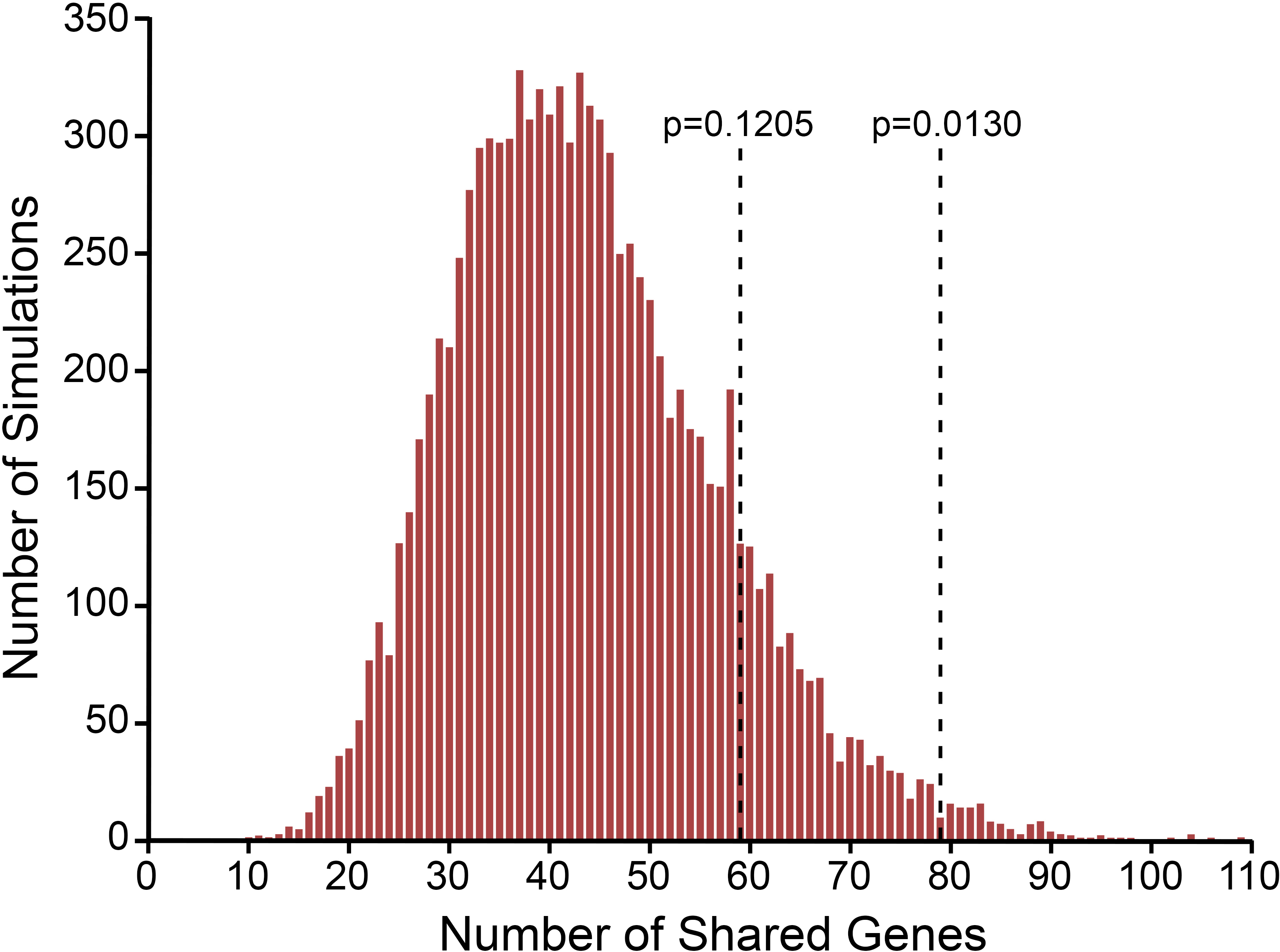 data are actually 79. The p value is the proportion of simulations that produce several randomly shared genes that is greater