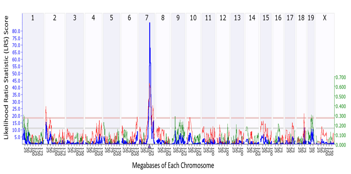 Figure 4. Genetic mapping of Myo7a. A statistically significant expression quantitative trait locus (eQTL) is present at the location of Myo7a itself (the triangle on the x-axis) on chromosome 7, making it a cis-eQTL. The left y-axis provides the likelihood ratio statistic (LRS) score in blue, and the right y-axis provides the additive
