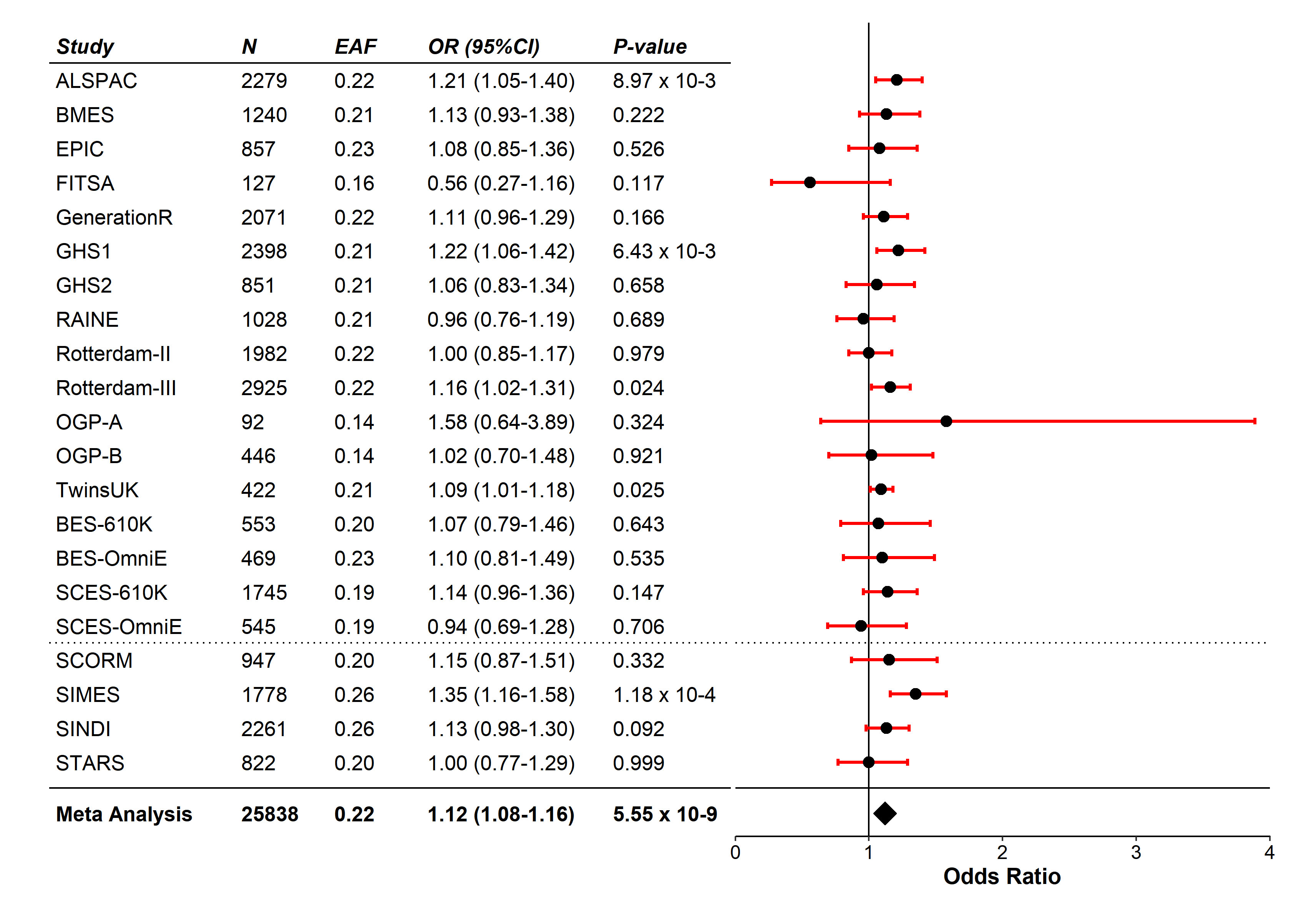Figure 4. Forest plot and summary table for lead variant rs7673984 across all cohorts. Studies listed above the dotted line are new