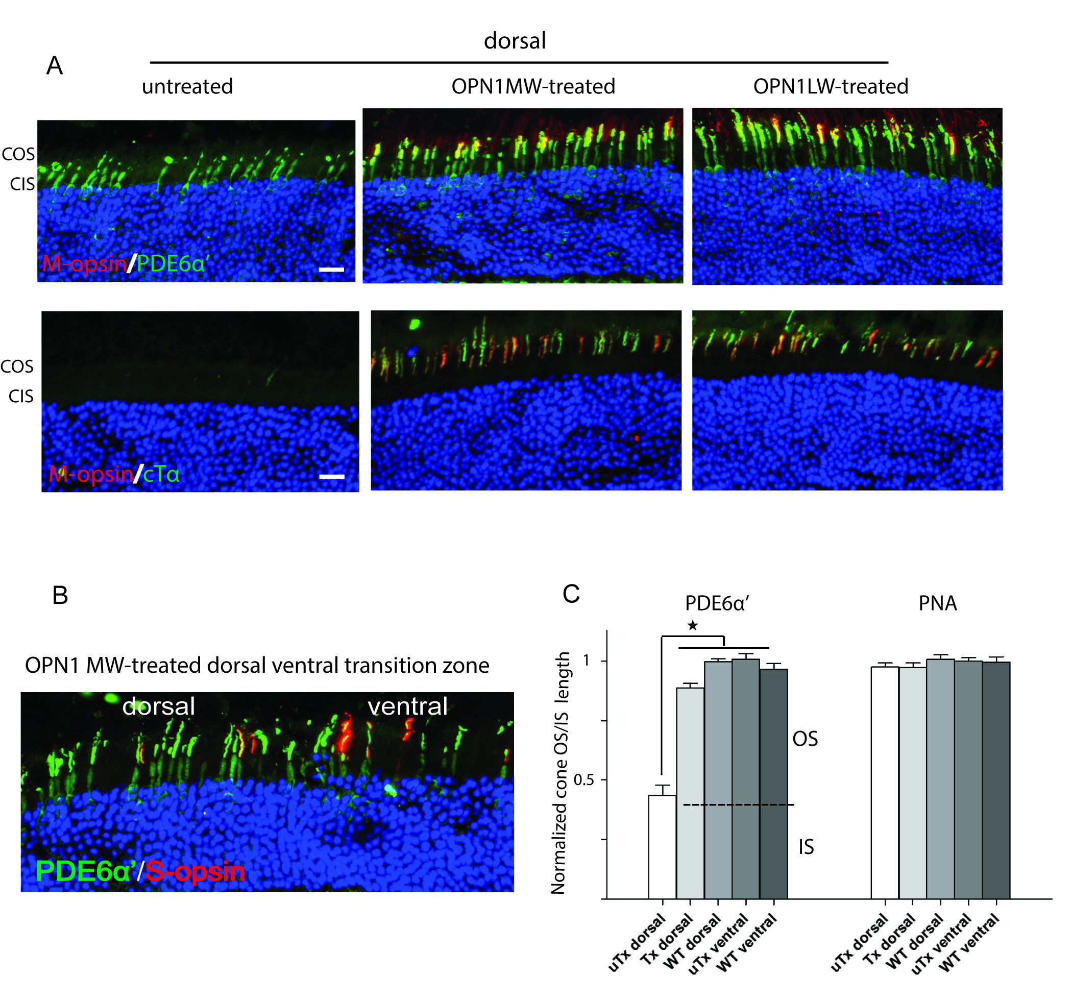 opsins were colocalized with PDE6α’ and cTα in the cone outer segments. Scale bar: 20 µm. B: An image from the dorsal-ventral transition zone in an OPN1LW-treated Opn1mw−/− eye showing equal lengths of cone outer segments with PDE6α’ staining. S-opsin was detected only in the ventral hemisphere.