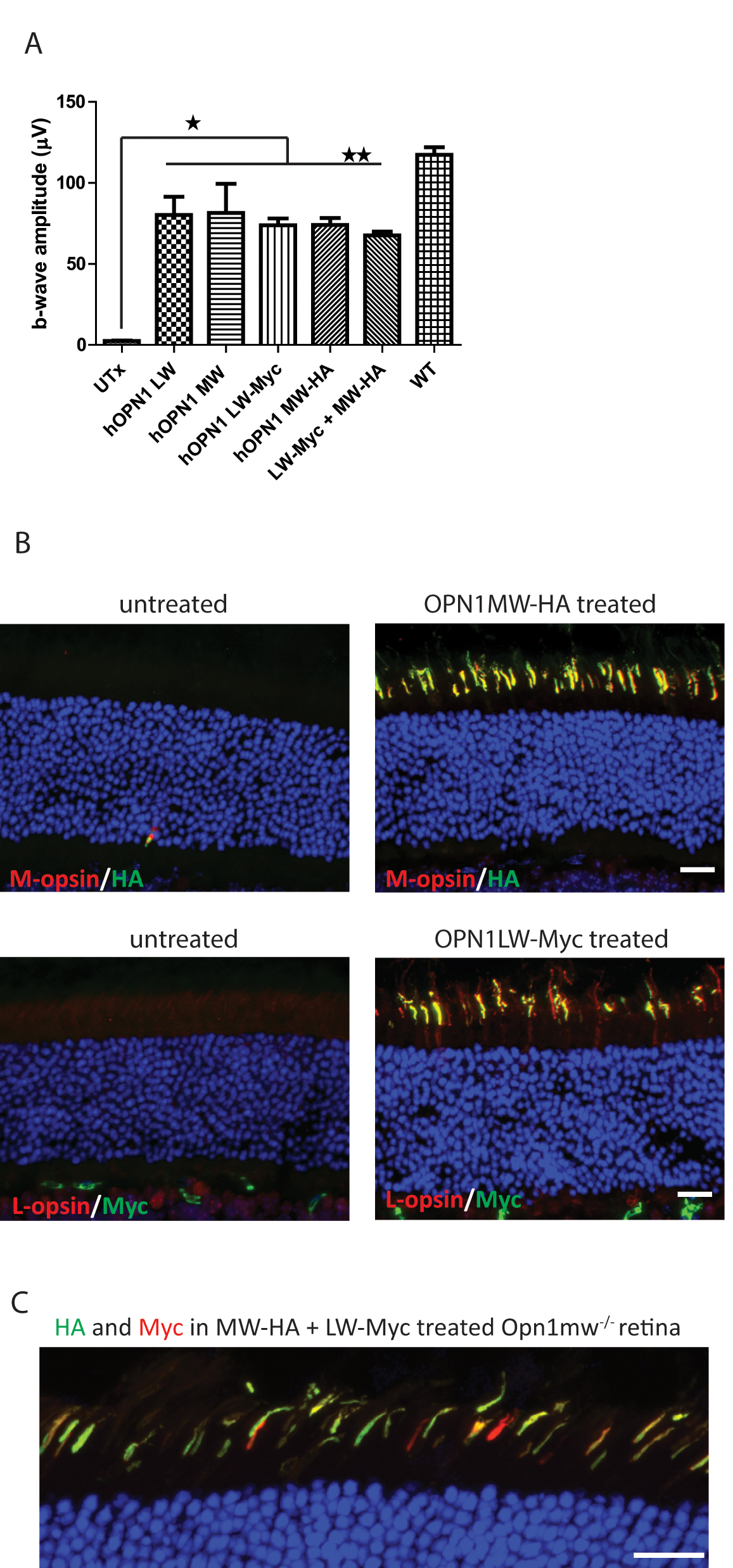 Figure 4. M-cone ERG responses and M- and L-opsin expression in AAV5-PR2.1-OPN1MW-HA or/and AAV5-PR2.1-OPN1LW-Myc-treated Opn1mw−/− eyes. A: M-cone electroretinogram (ERG) b-wave amplitudes showed similar levels of rescue in OPN1LW-, OPN1MW-, OPN1LW-Myc-, OPN1MW-HA-,