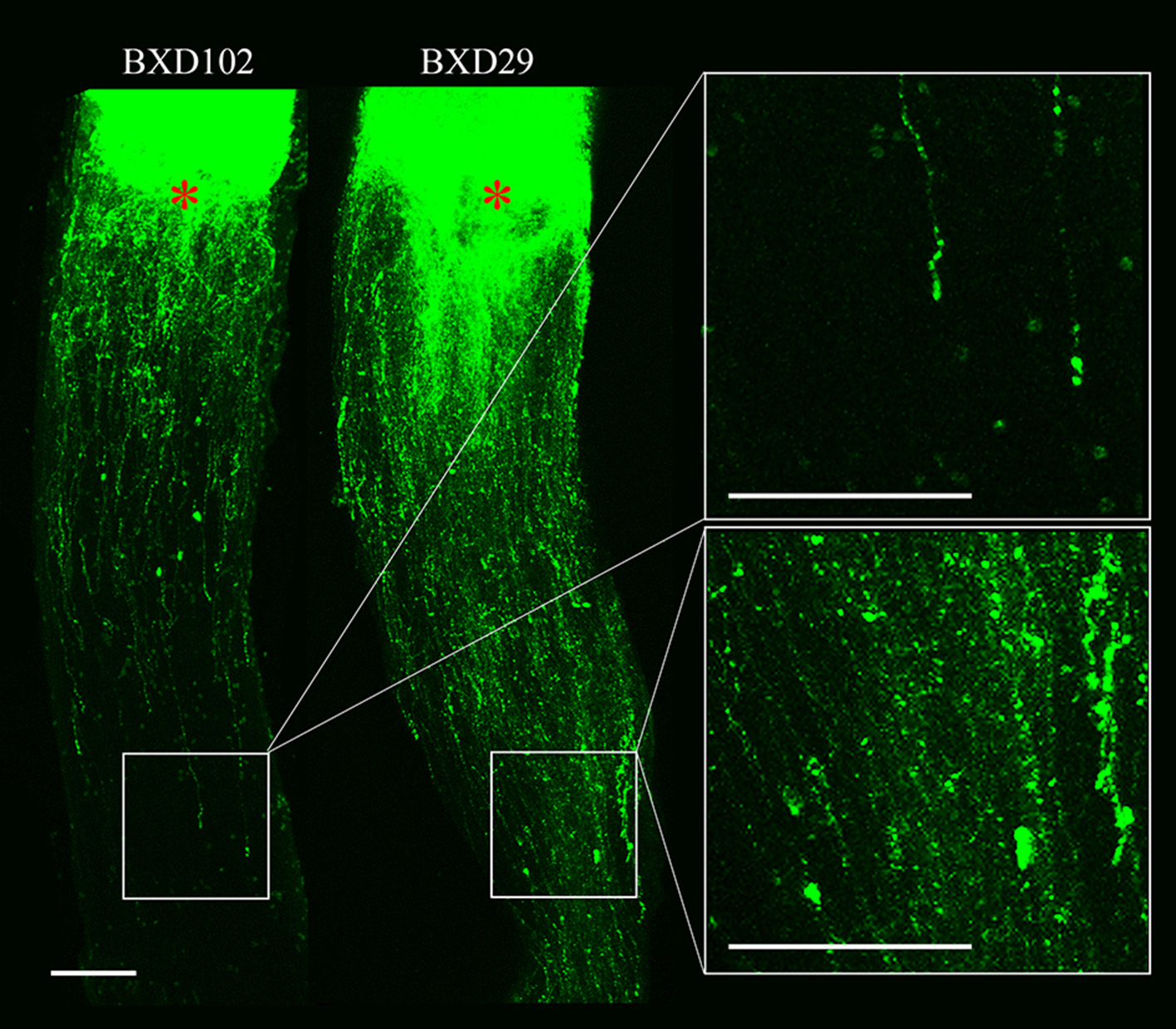 Comparison of regenerated axons in strains with the least regeneration (BXD102) and the greatest regeneration (BXD29). Higher magnification of axons at 1 mm (the boxed region) from the crush site are shown. Scale bar = 100 µm.