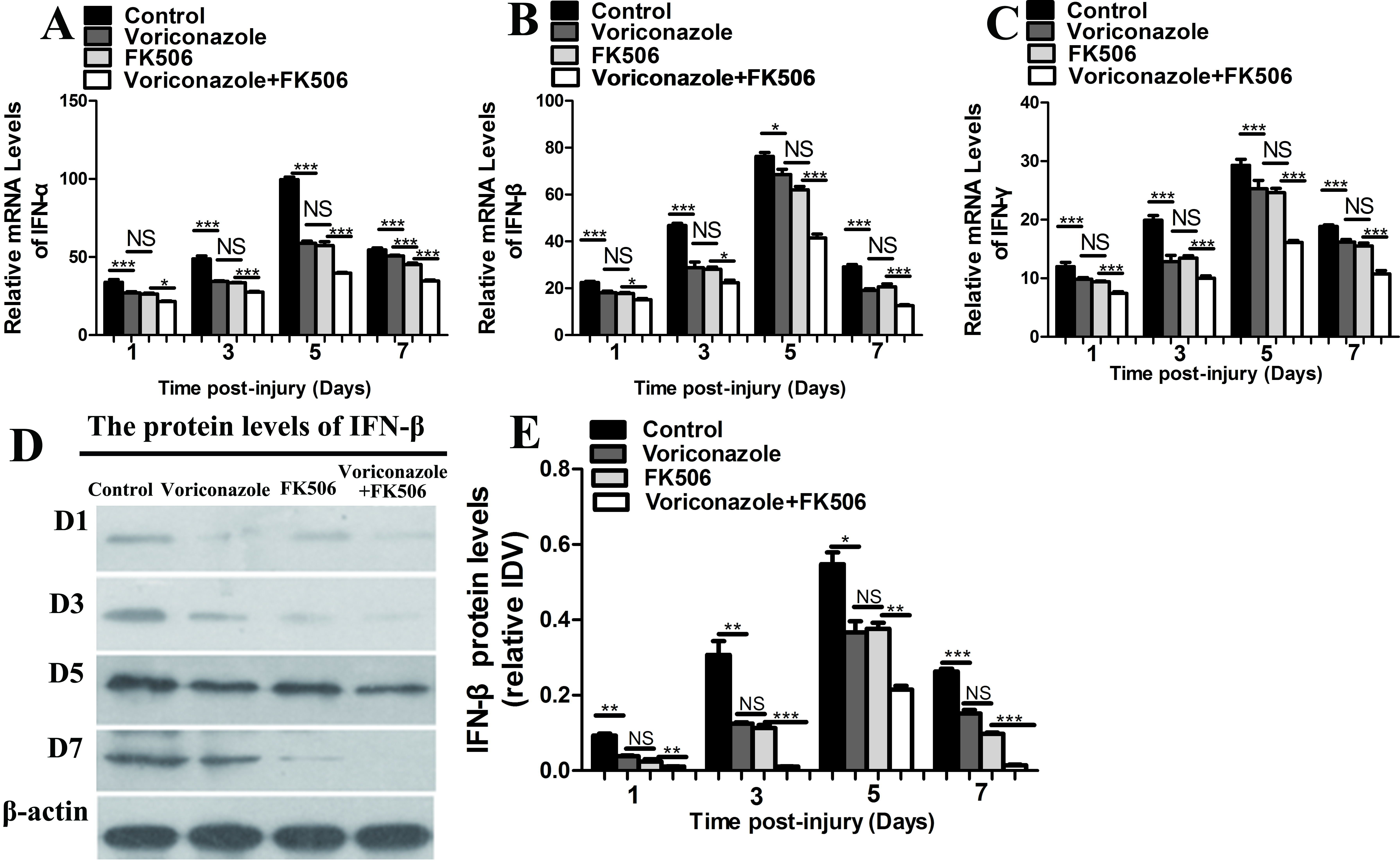 The mRNA levels of type I interferons (IFNs), including IFN-α (A) and IFN-β (B), and the type II IFN IFN-γ (C; normalized to β-actin), as well as the protein levels and band intensity of IFN-β (D), were reduced by voriconazole and FK506 in the murine fungal keratitis model at day 1, day 3, day 5, and day 7 post-infection.