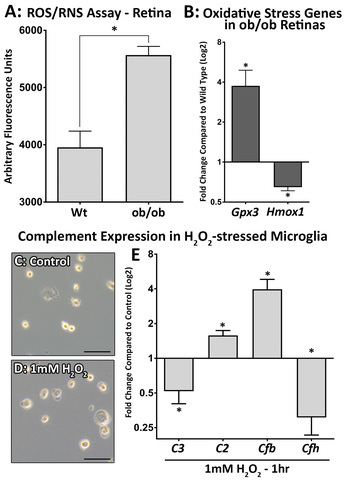 Figure 4. Increased oxidative stress correlates to changes in complement genes in ob/ob mice. A: A comparison of retinas isolated from the wild-type (wt) control mice to the retinas of the ob/ob mice indicated a statistically