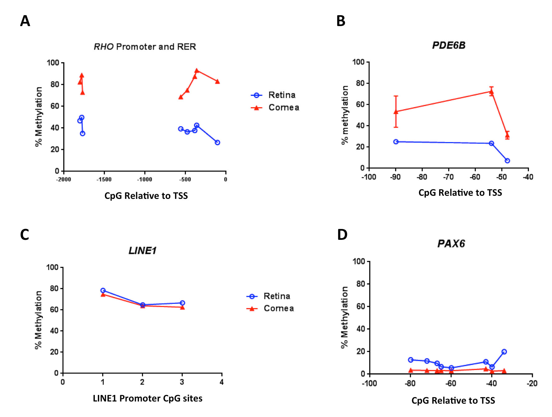 of (A) RHO, (B) PDE6B, (C) LINE1 retrotransposon repeats, and (D) PAX6. Data are presented as percentage methylation at the indicated genomic positions relative to the gene’s canonical transcriptional
