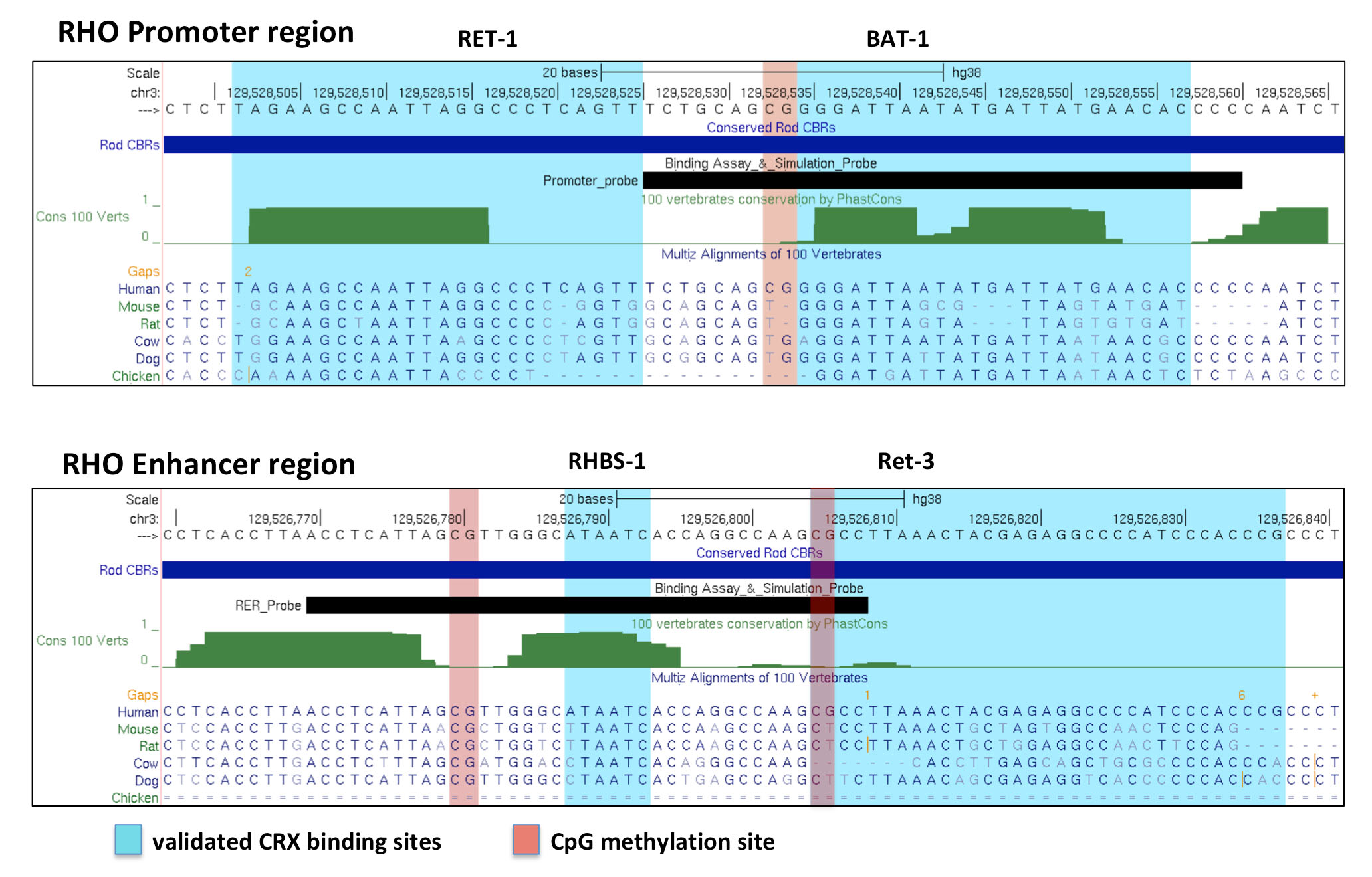 RHO promoter (top) and RER (bottom) in the UCSC Genome Browser’s hg38 human genome assembly aligned with five other vertebrate