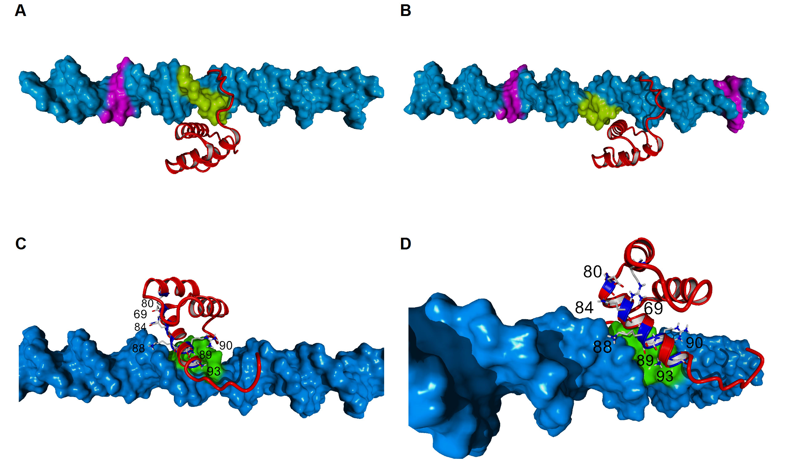 Figure 4. Model of human CRX bound to the human RHO promoter (A) and RER (B). The CRX binding domain is shown in red, the methylation sites in magenta, and the CRX binding sequence in green. C and D: Validation of the CRX model using disease-linked amino acids. Labeled amino acids are either in close proximity to DNA or