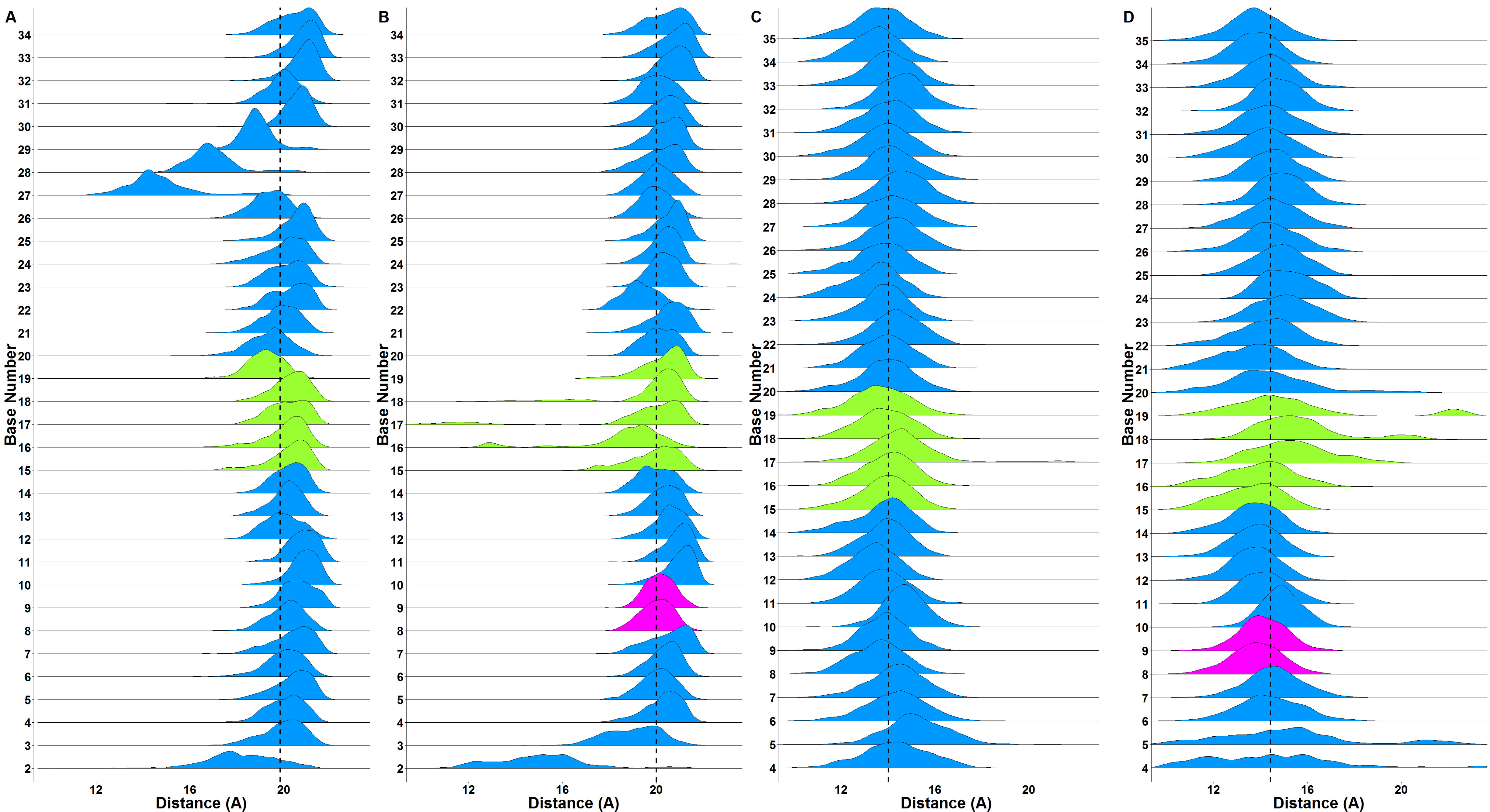 Figure 5. Structural and dynamic effects of methylation on the RHO promoter. A: Density plots for the major groove. B: The methylated major groove. C: The minor groove. D: Methylated minor groove widths for the methylated. The nucleotides within the CRX binding region are shown in green, and
