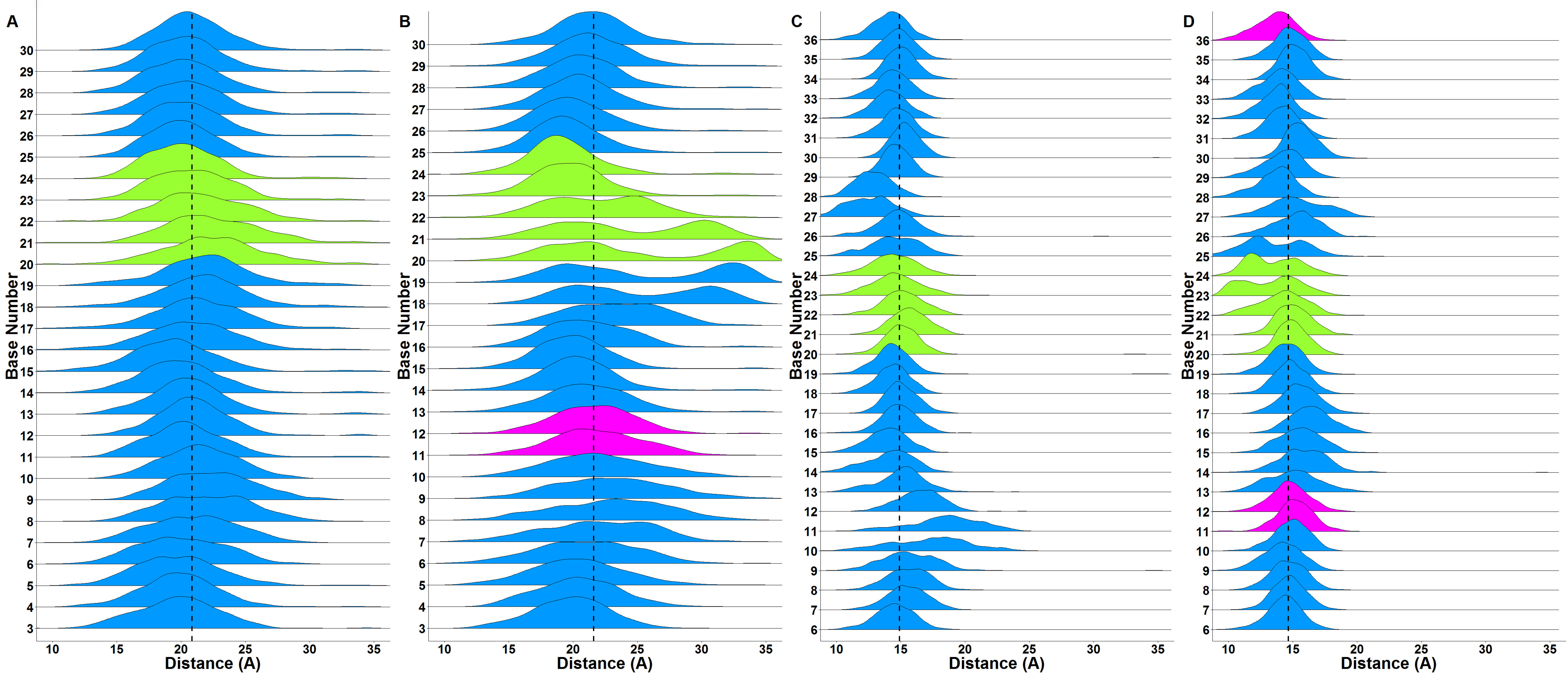 Figure 6. Structural and dynamic effects of methylation on the RER sequence. A: Density plots for the major groove. B: The methylated major groove. C: The minor groove. D: The methylated minor groove widths for the methylated. The nucleotides within the CRX binding region are shown in green,
