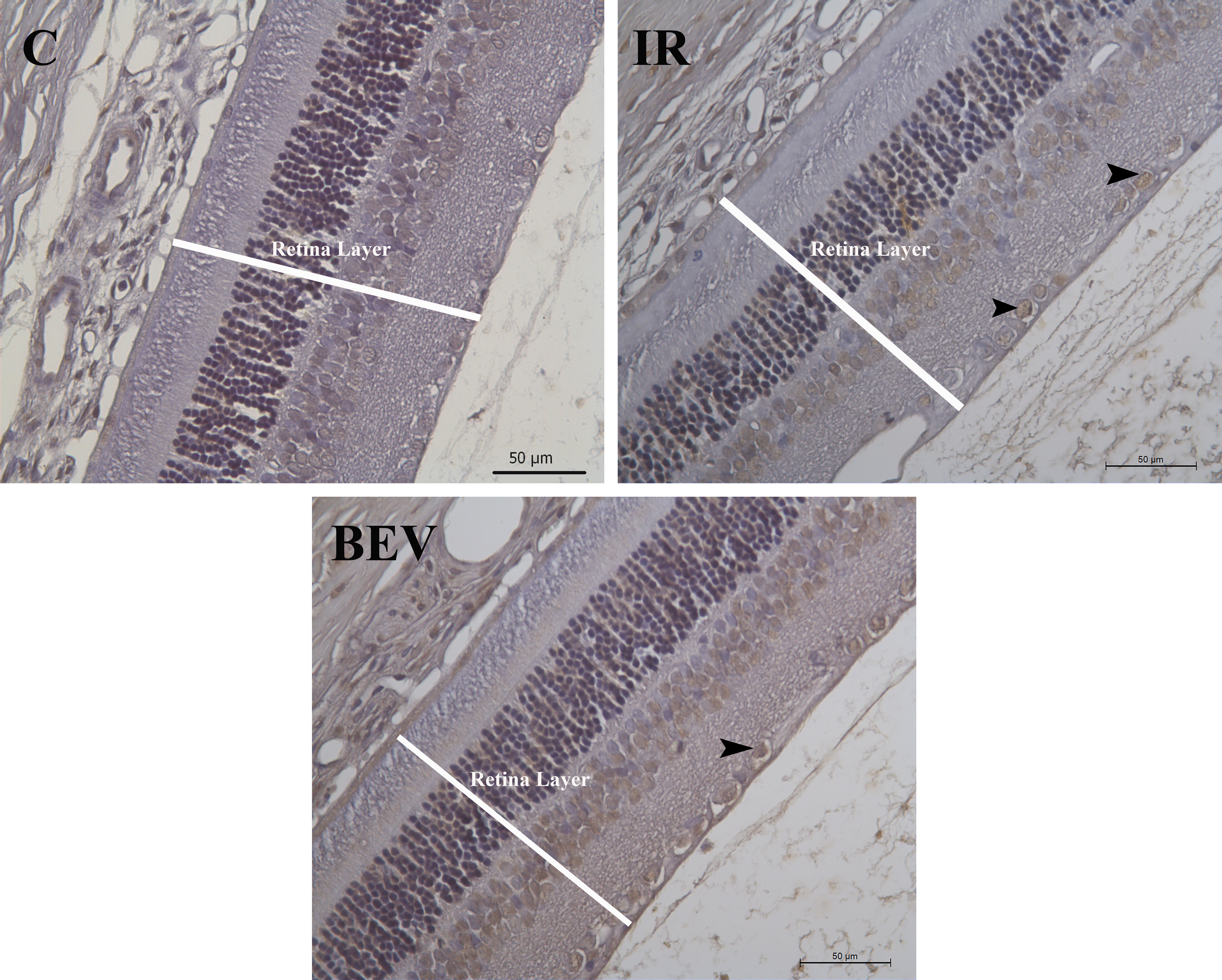 Figure 4. Immunohistochemical evaluation of TUNEL-stained tissue samples: control, IR, and BEV. The black arrows point out the apoptotic