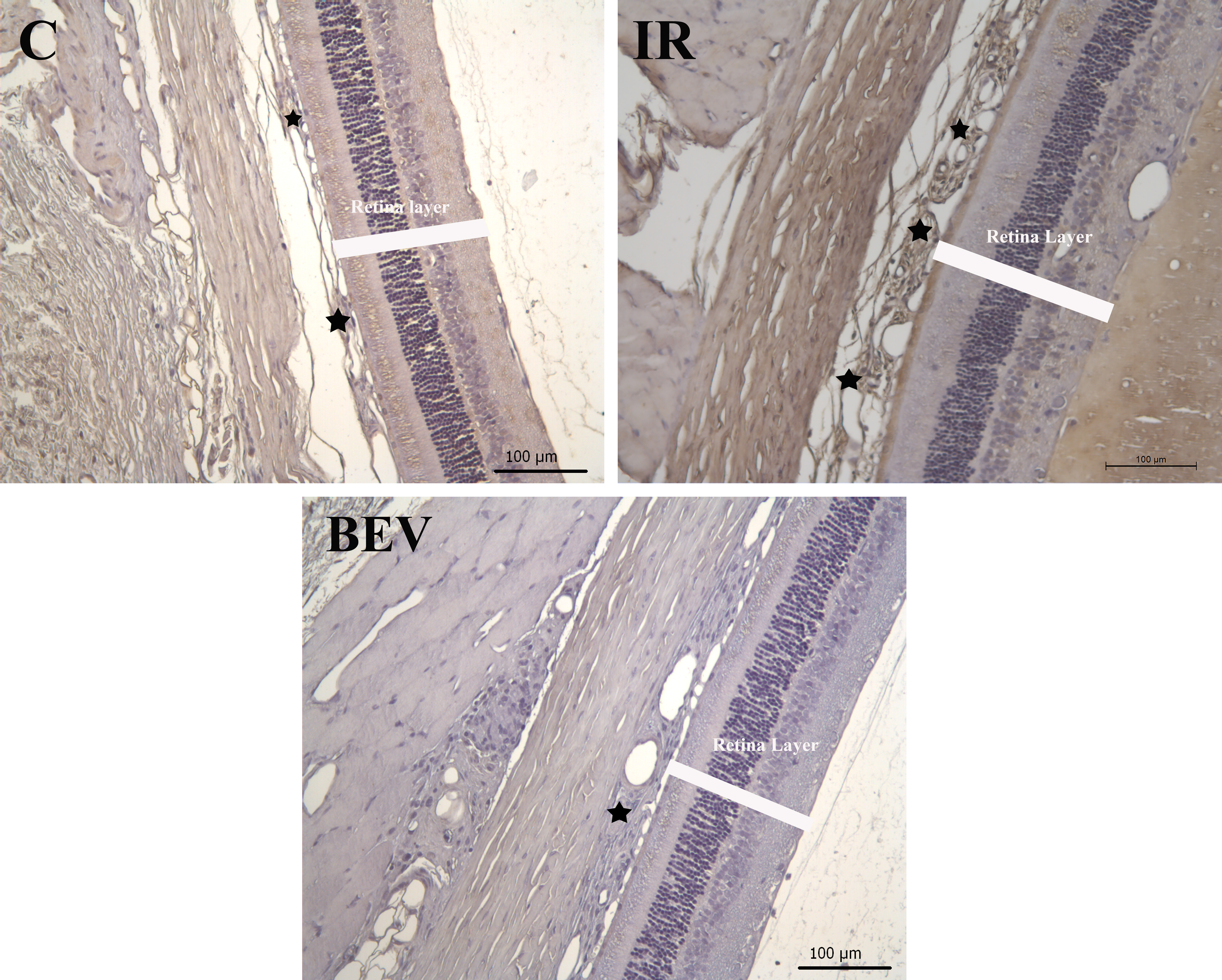 the retina and choroid layers of the ischemia and reperfusion (IR) group, but this result was decreased in the bevacizumab