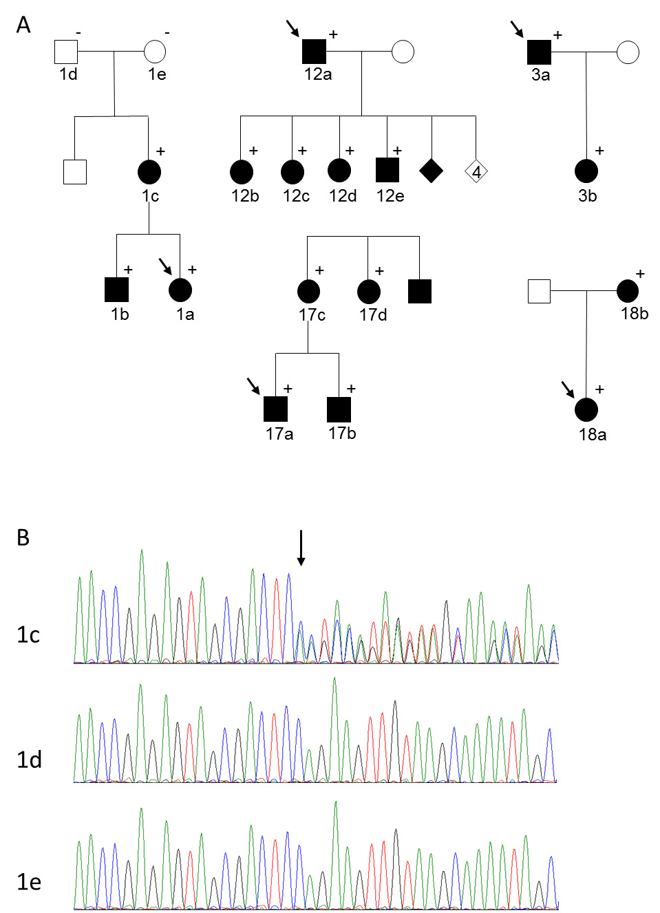 Figure 1. Pedigrees and genetic analysis. A: Pedigree of the families recruited. Round symbols indicate female; square, male; diamond, unspecified gender; fully filled