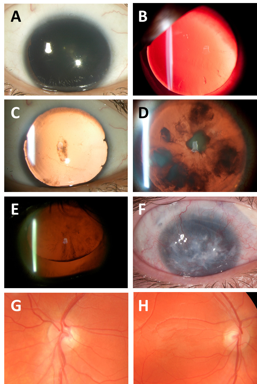 Figure 2. Clinical photographs of the eyes of individuals with aniridia. A: Slit-lamp photo showing total aniridia (individual 5). B: Slit-lamp retroillumination photo showing total aniridia (individual 2). C: Slit-lamp retroillumination photo showing polar cataract (individual 5). D: Slit-lamp retroillumination photo showing anterior polar and cortical cataract (individual 7). E: Slit-lamp retroillumination photo showing lens subluxation (individual 1b). F: Slit-lamp photo showing opacification and vascularization of the cornea due to limbal stem cell failure (individual 1b).