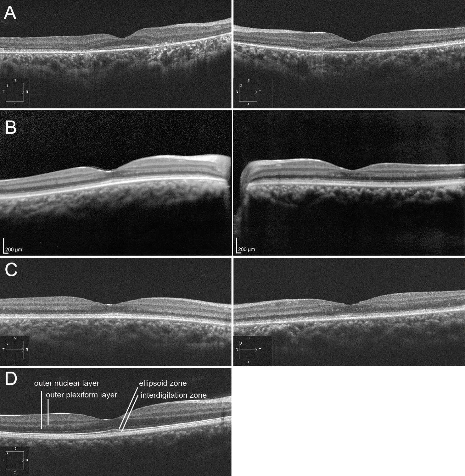 zone, (23 years of age). B: OCT images (patient JU#1303) reveal a continuous but blurred ellipsoid zone, (9 years of age). C: OCT images for patient JU#1303 at the age of 11 are similar to those at the age of 9. D: The outer retinal layers of the right eye are labeled in a male control without any retinal disease in his early 20s.