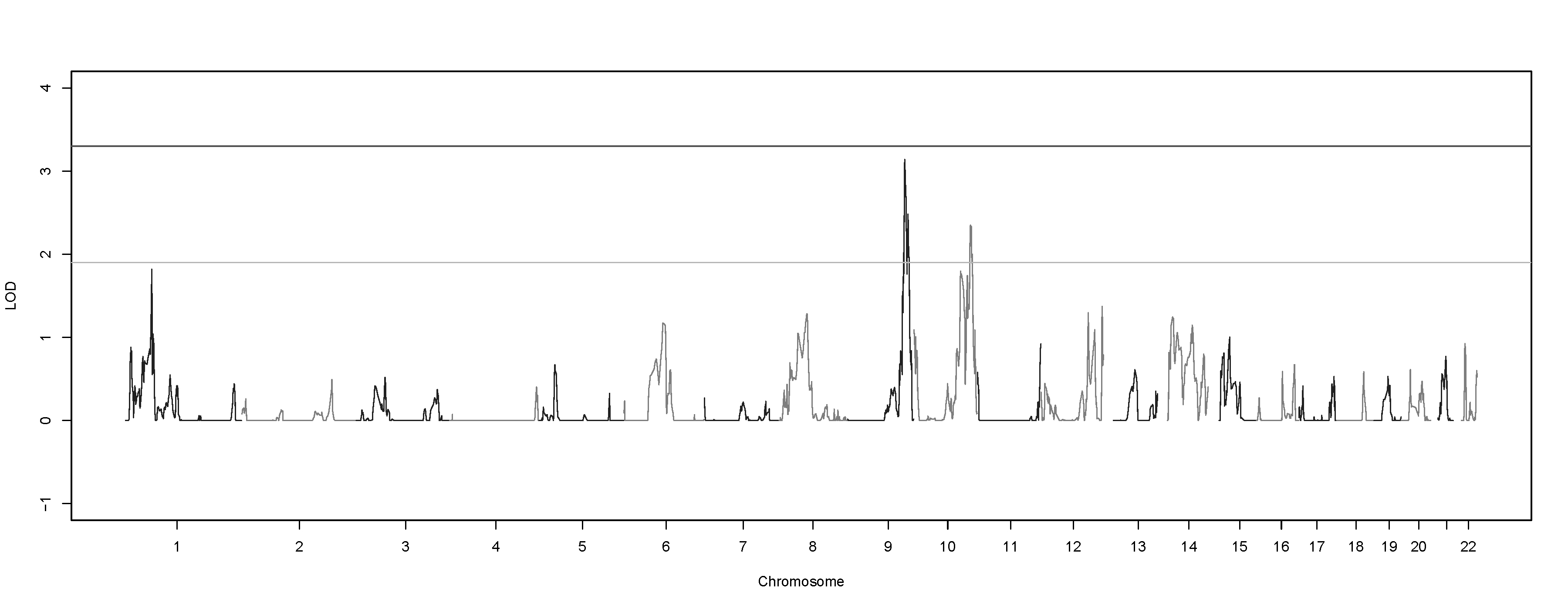 Figure 3. Genome-wide multipoint HLOD scores. Plot of the genome-wide multipoint heterogeneity logarithm of the odds (HLOD) scores produced