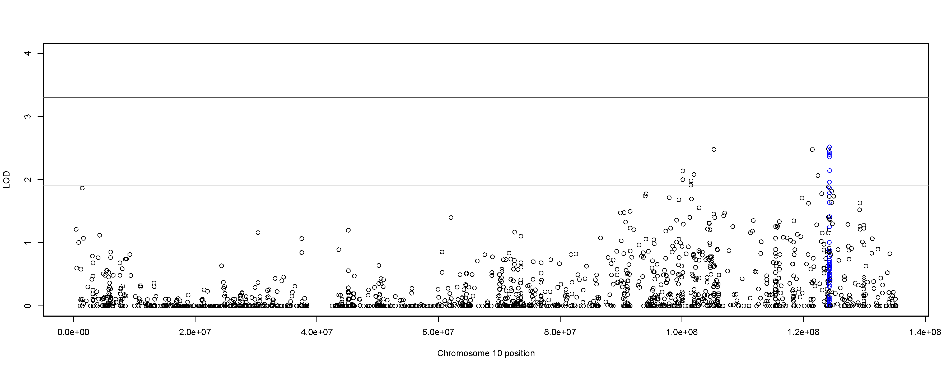 Figure 5. Chromosome 10 two-point single-variant LOD scores. Plot of the single-variant two-point heterogeneity logarithm of the odds