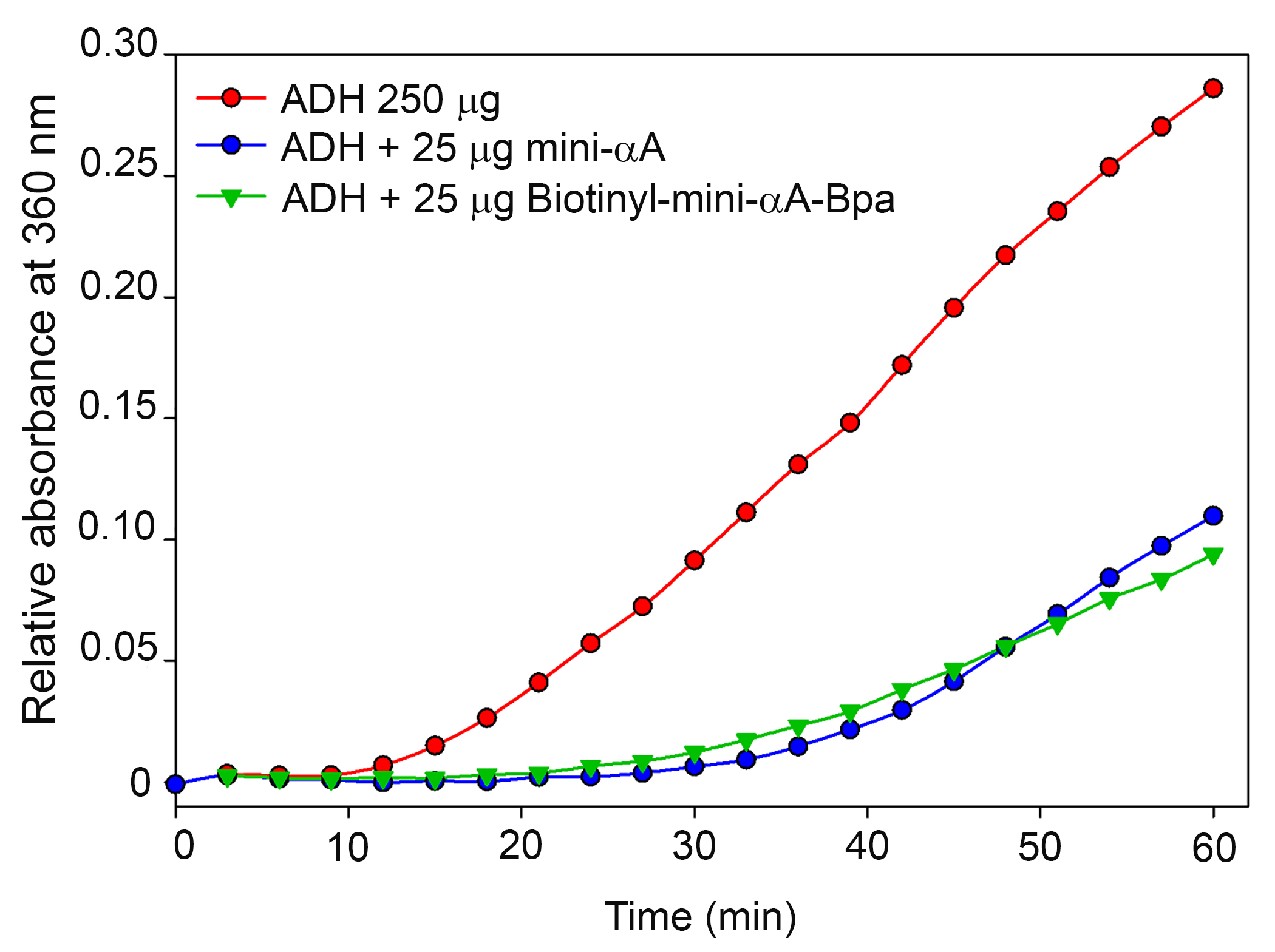 Chaperone-like activity of αA-minichaperone and biotinyl-mini-αA-Bpa using ADH. Experimental details are included in the Methods section.