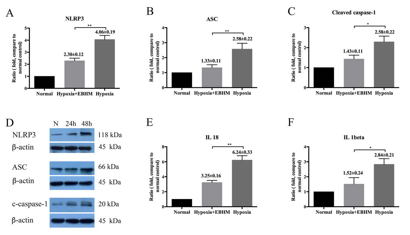 at least three times. Panel (E) “**” refers to IL-18 in hypoxia + EBHM group/normal control ratio versus the hypoxia model group/normal control ratio, p<0.01;